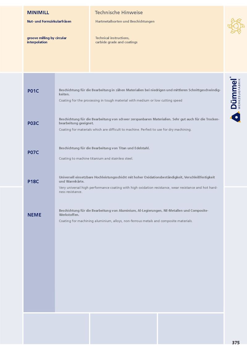 MINIMILL Technische Hinweise Nut- und Formzirkularfräsen Hartmetallsorten und Beschichtungen groove milling by circular Technical instructions, interpolation carbide grade and coatings Beschichtung für die Bearbeitung in zähen Materialien bei niedrigen und mittleren Schnittgeschwindig- P01C keiten. Coating for the processing in tough material with medium or low cutting speed Beschichtung für die Bearbeitung von schwer zerspanbaren Materialien. Sehr gut auch für die Trocken- P03C bearbeitung geeignet. Coating for materials which are difficult to machine. Perfect to use for dry machining. Beschichtung für die Bearbeitung von Titan und Edelstahl. P07C Coating to machine titanium and stainless steel. Universell einsetzbare Hochleistungsschicht mit hoher Oxidationsbeständigkeit, Verschleißfestigkeit P18C und Warmhärte. Very universal high performance coating with high oxidation resistance, wear resistance and hot hard- ness resistance. Beschichtung für die Bearbeitung von Aluminium, Al-Legierungen, NE-Metallen und Composite- NEME Werkstoffen. Coating for machining aluminium, alloys, non-ferrous metals and composite materials. 375