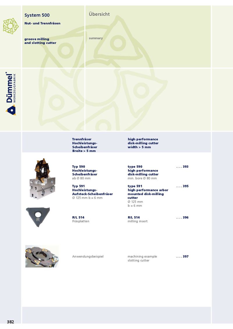 System 500 Übersicht Nut- und Trennfräsen groove milling summary and slotting cutter Trennfräser high performance Hochleistungs- disk-milling cutter Scheibenfräser width > 5 mm Breite > 5 mm Typ 590 type 590 . . . 393 Hochleistungs- high performance Scheibenfräser disk-milling cutter ab Ø 80 mm min. bore Ø 80 mm Typ 591 type 591 . . . 395 Hochleistungs- high performance arbor Aufsteck-Scheibenfräser mounted disk-milling Ø 125 mm b = 6 mm cutter Ø 125 mm b = 6 mm R/L 514 R/L 514 . . . 396 Fräsplatten milling insert Anwendungsbeispiel machining example . . . 397 slotting cutter 382
