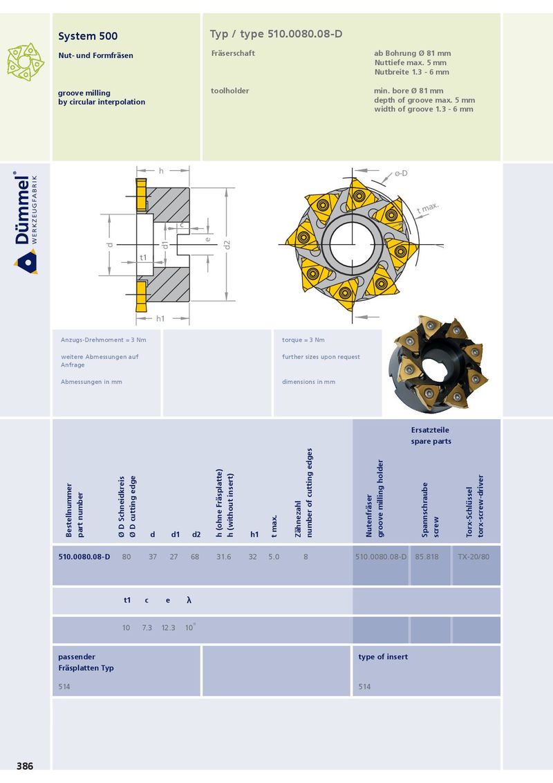 a a D min. System 500 Typ / type 510.0080.08-D 9.0 Nut- und Formfräsen Fräserschaft ab Bohrung Ø 81 mm Nuttiefe max. 5 mm Nutbreite 1.3 - 6 mm groove milling toolholder min. bore Ø 81 mm by circular interpolation depth of groove max. 5 mm width of groove 1.3 - 6 mm 15° 60° 30∞ h ø-D D min. d1 22.4 t max. c e 1 x 45° d d1 d2 λ t1 22 Mitnahmeflächen nach DIN 1835 clamping surface DIN 1835 h1 d1 Anzugs-Drehmoment = 3 Nm torque = 3 Nm b d h6 5° d E s weitere Abmessungen auf further sizes upon request Anfrage Abmessungen in mm dimensions in mm Ds = 17.7 S Ersatzteile 45° spare parts Bestellnummer part number Ø D Schneidkreis Ø D cutting edge d d1 d2 h (ohne Fräsplatte) h (without insert) h1 t max. Zähnezahl number of cutting edges Nutenfräser groove milling holder Spannschraube screw Torx-Schlüssel torx-screw-driver 510.0080.08-D 80 37 27 68 31.6 32 5.0 8 510.0080.08-D 85.818 TX-20/80 t1 c e λ 10 7.3 12.3 10 ° passender type of insert Fräsplatten Typ 514 514 386