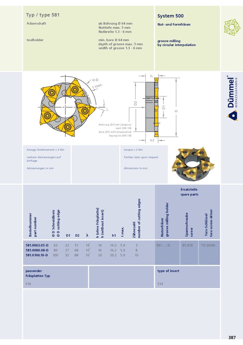 Typ / type 581 System 500 Fräserschaft ab Bohrung Ø 64 mm Nut- und Formfräsen Nuttiefe max. 5 mm Nutbreite 1.3 - 6 mm toolholder min. bore Ø 64 mm groove milling depth of groove max. 5 mm by circular interpolation width of groove 1.3 - 6 mm a a D min. h ø-D 9.0 t max. D2 λ D1 D Bohrung (D1) mit Längsnut Bohrung (D1) mit Längsnut nach DIN 138 15° 60° nach DIN 138 bore (D1) with longitudinal bore (D1) with longitudinal keyway to DIN 138 30∞ keyway to DIN 138 h1 Bohrung (D1) mit Längsnut nach DIN 138 bore (D1) with longitudinal keyway to DIN 138 Anzugs-Drehmoment = 3 Nm torque = 3 Nm D min. weitere Abmessungen auf further sizes upon request Anfrage Abmessungen in mm dimensions in mm 1 x 45° Ersatzteile h2 spare parts 22 Mitnahmeflächen nach DIN 1835 t max. h clamping surface DIN 1835 λ d1 b d h6 c 5° d E s e d d1 d2 Bestellnummer part number Ø D Schneidkreis Ø D cutting edge D1 D2 λ h1 h (ohne Fräsplatte) h (without insert) t max. Nutenfräser Zähnezahl number of cutting edges groove milling holder Spannschraube screw Torx-Schlüssel torx-screw-driver Ds = 17.7 t1 581.0063.05-D 63 22 51 14 ° 14 14.2 5.0 5 581. ...-D S 85.818 TX-20/80 581.0080.08-D 80 27 68 10 ° 16 16.2 5.0 8 581.0100.10-D 100 32 88 10 ° 20 20.2 5.0 10 45° h1 passender type of insert Fräsplatten Typ 514 514 387