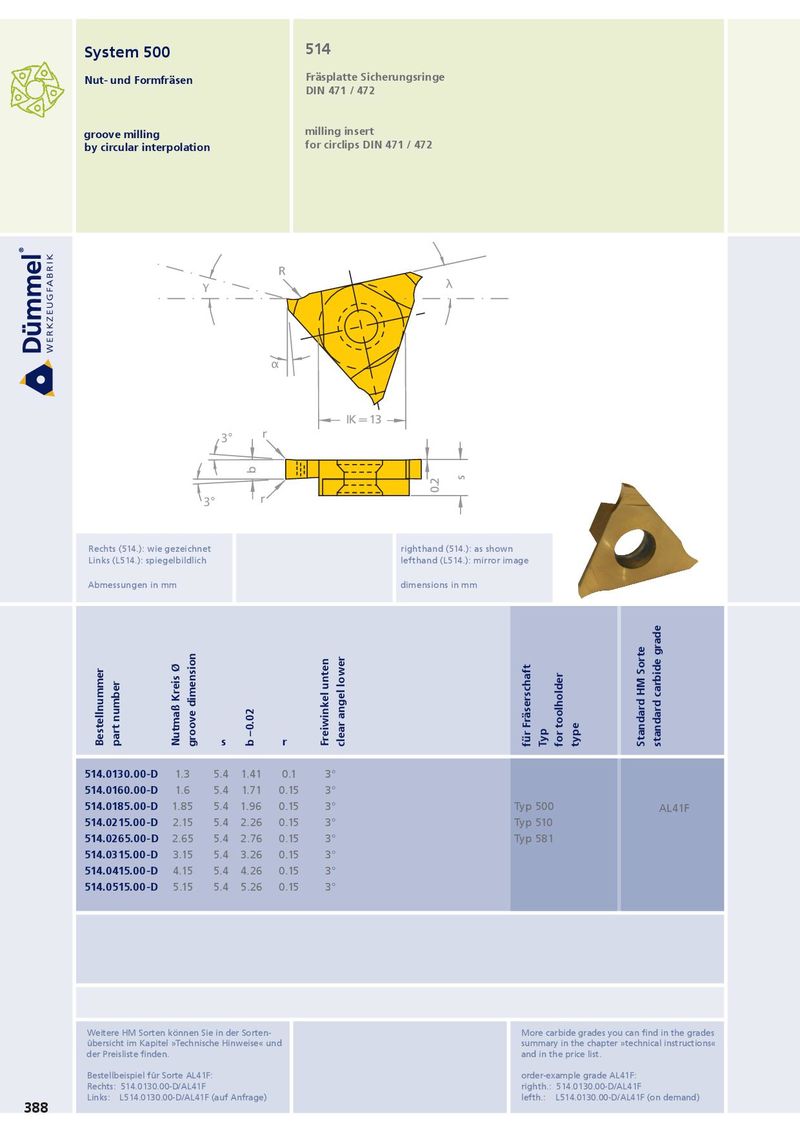 System 500 514 Nut- und Formfräsen Fräsplatte Sicherungsringe DIN 471 / 472 groove milling milling insert by circular interpolation for circlips DIN 471 / 472 R D min. γ λ 9.0 α IK = 13 r 3° 15° b 60° s 0.2 30∞ 3° r D min. Rechts (514.): wie gezeichnet righthand (514.): as shown Links (L514.): spiegelbildlich lefthand (L514.): mirror image Abmessungen in mm dimensions in mm 5° Ds = 21.7 b Bestellnummer part number s Nutmaß Kreis Ø groove dimension b –0.02 r Freiwinkel unten clear angel lower für Fräserschaft Typ for toolholder type Standard HM Sorte standard carbide grade 60° S E d1 514.0130.00-D 1.3 5.4 1.41 0.1 3° b d h6 514.0160.00-D 1.6 5.4 1.71 0.15 3° d E s t 514.0185.00-D 1.85 5.4 1.96 0.15 3° Typ 500 AL41F Fräserschaft 514.0215.00-D 2.15 5.4 2.26 0.15 3° Typ 510 shank face 514.0265.00-D 2.65 5.4 2.76 0.15 3° Typ 581 514.0315.00-D 3.15 5.4 3.26 0.15 3° 514.0415.00-D 4.15 5.4 4.26 0.15 3° 514.0515.00-D 5.15 5.4 5.26 0.15 3° Ansicht X Klemmhalter Stirnseite toolholder face Weitere HM Sorten können Sie in der Sorten- More carbide grades you can find in the grades übersicht im Kapitel »Technische Hinweise« und summary in the chapter »technical instructions« der Preisliste finden. and in the price list. Bestellbeispiel für Sorte AL41F: order-example grade AL41F: Rechts: 514.0130.00-D/AL41F righth.: 514.0130.00-D/AL41F Links: L514.0130.00-D/AL41F (auf Anfrage) lefth.: L514.0130.00-D/AL41F (on demand) 388