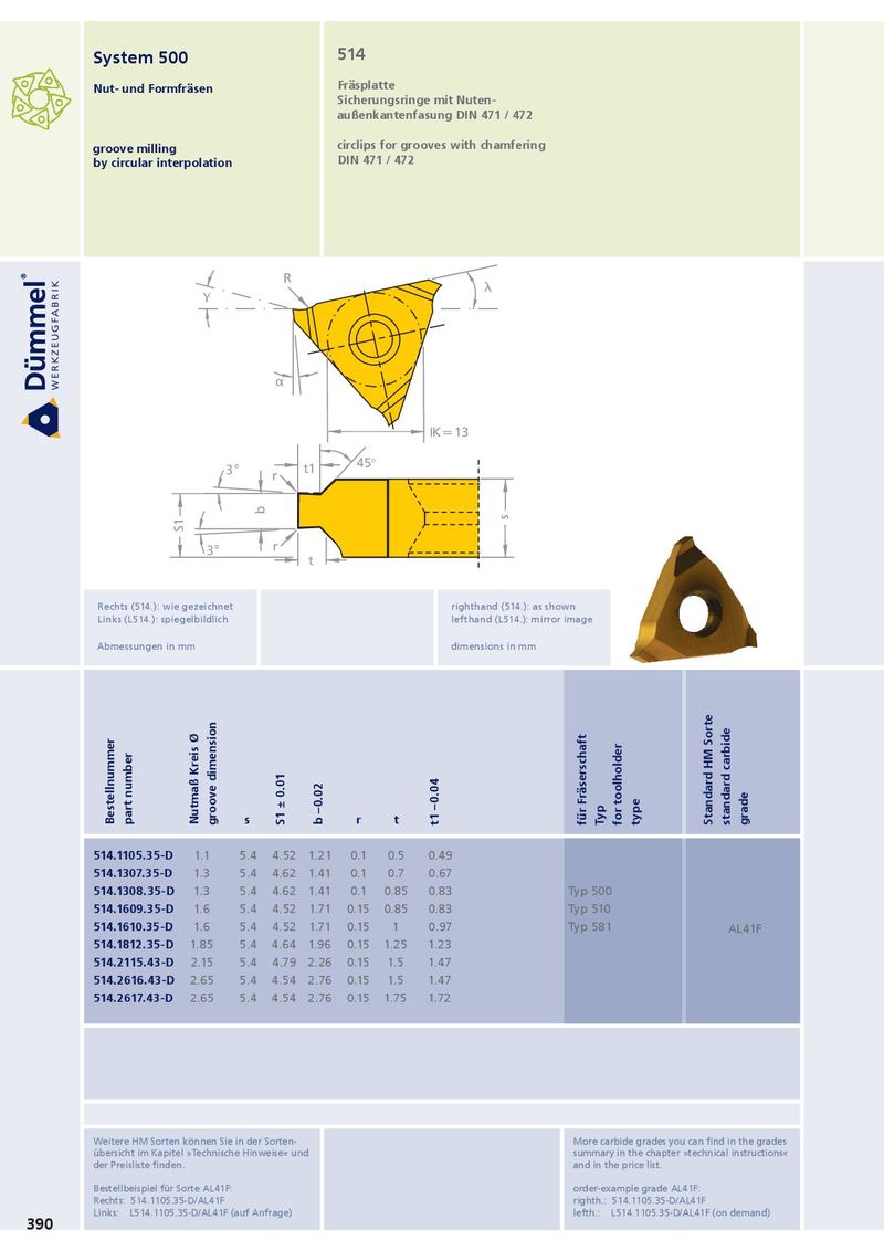 System 500 514 Nut- und Formfräsen Fräsplatte Sicherungsringe mit Nuten- außenkantenfasung DIN 471 / 472 groove milling circlips for grooves with chamfering by circular interpolation DIN 471 / 472 R λ γ R λ γ α α IK = 13 IK = 13 45° 3° t1 r b 45° s 3° t1 S1 r r 3° b t s S1 r 3° Rechts (514.): wie gezeichnet righthand (514.): as shown t Links (L514.): spiegelbildlich lefthand (L514.): mirror image Abmessungen in mm dimensions in mm D min. D min. 9.0 9.0 Bestellnummer part number Nutmaß Kreis Ø groove dimension s S1 ± 0.01 b –0.02 r t t1 –0.04 für Fräserschaft Typ for toolholder type Standard HM Sorte standard carbide grade 514.1105.35-D 1.1 5.4 4.52 1.21 0.1 0.5 0.49 514.1307.35-D 1.3 5.4 4.62 1.41 0.1 0.7 0.67 514.1308.35-D 1.3 5.4 4.62 1.41 0.1 0.85 0.83 Typ 500 514.1609.35-D 1.6 5.4 4.52 1.71 0.15 0.85 0.83 Typ 510 15° 60° 514.1610.35-D 1.6 5.4 4.52 1.71 0.15 1 0.97 Typ 581 AL41F 514.1812.35-D 1.85 5.4 4.64 1.96 0.15 1.25 1.23 30∞ 514.2115.43-D 2.15 5.4 4.79 2.26 0.15 1.5 1.47 15° 60° 514.2616.43-D 2.65 5.4 4.54 2.76 0.15 1.5 1.47 D min. 30∞ 514.2617.43-D 2.65 5.4 4.54 2.76 0.15 1.75 1.72 D min. Weitere HM Sorten können Sie in der Sorten- More carbide grades you can find in the grades Ds = 21.7 übersicht im Kapitel »Technische Hinweise« und summary in the chapter »technical instructions« der Preisliste finden. and in the price list. Bestellbeispiel für Sorte AL41F: order-example grade AL41F: Ds = 21.7 Rechts: 514.1105.35-D/AL41F righth.: 514.1105.35-D/AL41F b Links: L514.1105.35-D/AL41F (auf Anfrage) lefth.: L514.1105.35-D/AL41F (on demand) 390 60° S E d1 b b d h6 d E s 60° Fräserschaft S E d1 shank face b d h6 d E s Fräserschaft shank face Ansicht X Klemmhalter Stirnseite toolholder face Ansicht X Klemmhalter Stirnseite toolholder face