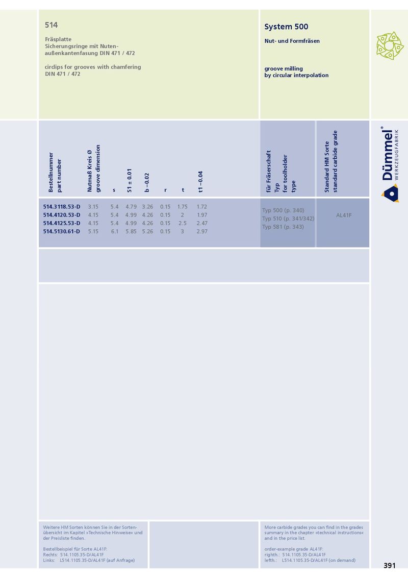 514 System 500 Fräsplatte Nut- und Formfräsen Sicherungsringe mit Nuten- außenkantenfasung DIN 471 / 472 circlips for grooves with chamfering groove milling DIN 471 / 472 by circular interpolation Bestellnummer part number Nutmaß Kreis Ø groove dimension s S1 ± 0.01 b –0.02 r t t1 –0.04 für Fräserschaft Typ for toolholder type Standard HM Sorte standard carbide grade 514.3118.53-D 3.15 5.4 4.79 3.26 0.15 1.75 1.72 Typ 500 (p. 340) 514.4120.53-D 4.15 5.4 4.99 4.26 0.15 2 1.97 AL41F Typ 510 (p. 341/342) 514.4125.53-D 4.15 5.4 4.99 4.26 0.15 2.5 2.47 Typ 581 (p. 343) 514.5130.61-D 5.15 6.1 5.85 5.26 0.15 3 2.97 Weitere HM Sorten können Sie in der Sorten- More carbide grades you can find in the grades übersicht im Kapitel »Technische Hinweise« und summary in the chapter »technical instructions« der Preisliste finden. and in the price list. Bestellbeispiel für Sorte AL41F: order-example grade AL41F: Rechts: 514.1105.35-D/AL41F righth.: 514.1105.35-D/AL41F Links: L514.1105.35-D/AL41F (auf Anfrage) lefth.: L514.1105.35-D/AL41F (on demand) 391