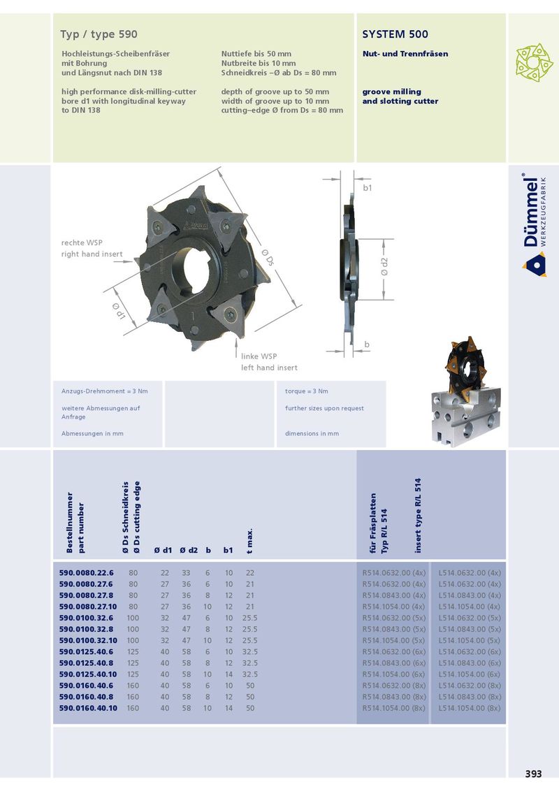 Typ / type 590 SySTEM 500 a Hochleistungs-Scheibenfräser Nuttiefe bis 50 mm Nut- und Trennfräsen a mit Bohrung Nutbreite bis 10 mm und Längsnut nach DIN 138 Schneidkreis –Ø ab Ds = 80 mm D min. high performance disk-milling-cutter depth of groove up to 50 mm groove milling bore d1 with longitudinal keyway width of groove up to 10 mm and slotting cutter to DIN 138 cutting–edge Ø from Ds = 80 mm rechte WSP b1 Ød1 right hand insert 15° 30∞ rechte WSP Ø Ds right hand insert rechte WSP right hand insert Ø d2 D min. linke WSP Ø d1 left hand insert ØDs linke WSP left hand insert b t linke WSP left hand insert Anzugs-Drehmoment = 3 Nm torque = 3 Nm weitere Abmessungen auf further sizes upon request Anfrage Abmessungen in mm dimensions in mm d1 d h6 E s Ansicht X ε r Bestellnummer part number Ø d1 Ø d2 b Ø Ds Schneidkreis Ø Ds cutting edge b1 t max. b für Fräsplatten Typ R/L 514 insert type R/L 514 S ε 590.0080.22.6 80 22 33 6 10 22 r R514.0632.00 (4x) L514.0632.00 (4x) 590.0080.27.6 80 27 36 6 10 21 R514.0632.00 (4x) L514.0632.00 (4x) t max. 590.0080.27.8 80 27 36 8 12 21 R514.0843.00 (4x) Fräserschaft L514.0843.00 (4x) 590.0080.27.10 80 27 36 10 12 21 R514.1054.00 (4x) shank face L514.1054.00 (4x) 590.0100.32.6 100 32 47 6 10 25.5 R514.0632.00 (5x) L514.0632.00 (5x) 590.0100.32.8 100 32 47 8 12 25.5 R514.0843.00 (5x) L514.0843.00 (5x) 590.0100.32.10 100 32 47 10 12 25.5 R514.1054.00 (5x) L514.1054.00 (5x) 590.0125.40.6 125 40 58 6 10 32.5 R514.0632.00 (6x) L514.0632.00 (6x) 590.0125.40.8 125 40 58 8 12 32.5 R514.0843.00 (6x) L514.0843.00 (6x) 590.0125.40.10 125 40 58 10 14 32.5 R514.1054.00 (6x) L514.1054.00 (6x) 590.0160.40.6 160 40 58 6 10 50 R514.0632.00 (8x) L514.0632.00 (8x) 590.0160.40.8 160 40 58 8 12 50 R514.0843.00 (8x) L514.0843.00 (8x) 590.0160.40.10 160 40 58 10 14 50 R514.1054.00 (8x) L514.1054.00 (8x) 393