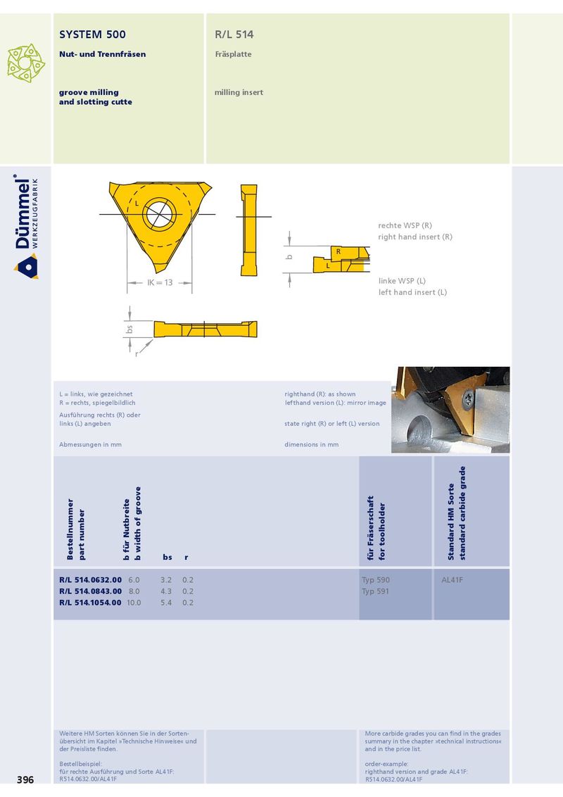 SySTEM 500 R/L 514 Nut- und Trennfräsen Fräsplatte groove milling milling insert and slotting cutte R γ λ L R α γ λ R L R γ λ γ λ IK = 13 L L rechte WSP (R) right hand insert (R) α r 3° R α α b L bs IK = 13 s IK = 13 linke WSP (L) 0.2 IK = 13 r left hand insert (L) 3° r 3° R r b 3° r 3° L R bs R b s b L L 0.2 bs bs s s r 3° 0.2 0.2 r 3° r 3° L = links, wie gezeichnet righthand (R): as shown R = rechts, spiegelbildlich lefthand version (L): mirror image Ausführung rechts (R) oder links (L) angeben state right (R) or left (L) version Abmessungen in mm b dimensions in mm 60° S E d1 b d h6 d E s t Fräserschaft b shank face b b 60° S E d1 60° b d h6 60° S S E d d1 E E s d1 Bestellnummer part number bs r b für Nutbreite b width of groove t b für Fräserschaft d h6 b d h6 for toolholder Standard HM Sorte standard carbide grade Fräserschaft d d E E s t s t shank face R/L 514.0632.00 6.0 3.2 0.2 Fräserschaft Fräserschaft Typ 590 AL41F R/L 514.0843.00 8.0 4.3 0.2 shank face shank face Typ 591 Ansicht X R/L 514.1054.00 10.0 5.4 0.2 Klemmhalter Stirnseite toolholder face Ansicht X Ansicht X Klemmhalter Stirnseite Ansicht X toolholder face Klemmhalter Stirnseite Klemmhalter Stirnseite toolholder face toolholder face Weitere HM Sorten können Sie in der Sorten- More carbide grades you can find in the grades übersicht im Kapitel »Technische Hinweise« und summary in the chapter »technical instructions« der Preisliste finden. and in the price list. Bestellbeispiel: order-example: für rechte Ausführung und Sorte AL41F: righthand version and grade AL41F: 396 R514.0632.00/AL41F R514.0632.00/AL41F