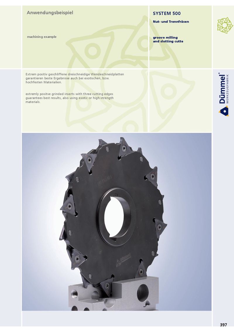 Anwendungsbeispiel SySTEM 500 Nut- und Trennfräsen machining example groove milling and slotting cutte Extrem positiv geschliffene dreischneidige Wendeschneidplatten garantieren beste Ergebnisse auch bei exotischen, bzw. hochfesten Materialien. extremly positve grinded inserts with three cutting edges guarantees best results, also using exotic or high-strength materials. 397