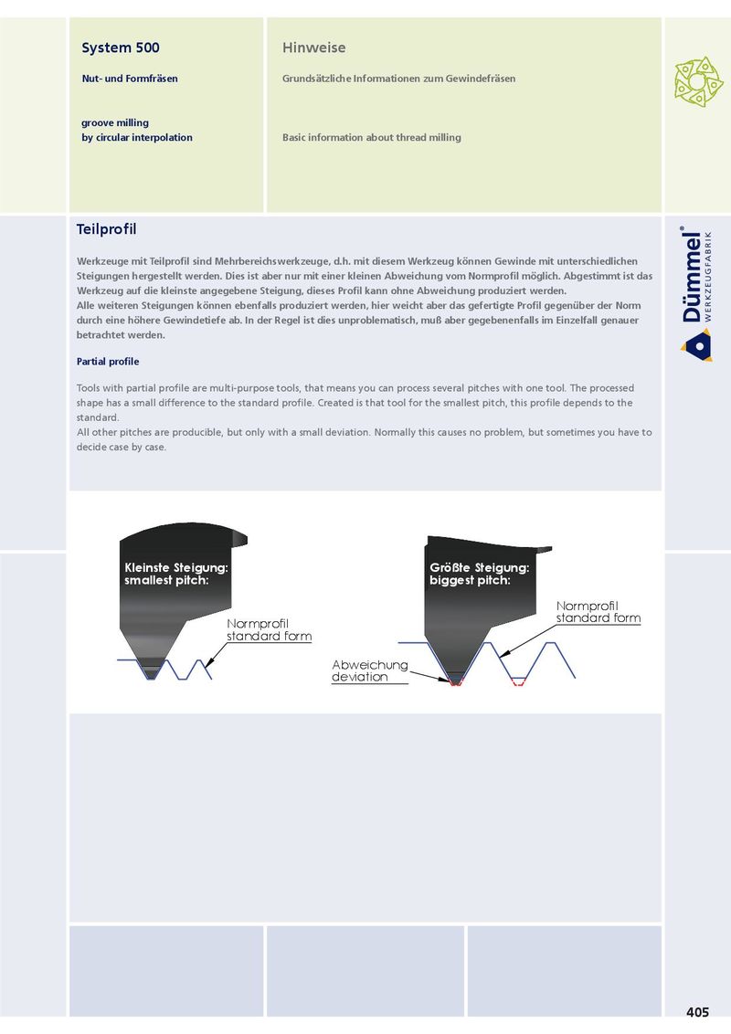 System 500 Hinweise Nut- und Formfräsen Grundsätzliche Informationen zum Gewindefräsen groove milling by circular interpolation Basic information about thread milling Teilprofil Werkzeuge mit Teilprofil sind Mehrbereichswerkzeuge, d.h. mit diesem Werkzeug können Gewinde mit unterschiedlichen Steigungen hergestellt werden. Dies ist aber nur mit einer kleinen Abweichung vom Normprofil möglich. Abgestimmt ist das Werkzeug auf die kleinste angegebene Steigung, dieses Profil kann ohne Abweichung produziert werden. Alle weiteren Steigungen können ebenfalls produziert werden, hier weicht aber das gefertigte Profil gegenüber der Norm durch eine höhere Gewindetiefe ab. In der Regel ist dies unproblematisch, muß aber gegebenenfalls im Einzelfall genauer betrachtet werden. Partial profile Tools with partial profile are multi-purpose tools, that means you can process several pitches with one tool. The processed shape has a small difference to the standard profile. Created is that tool for the smallest pitch, this profile depends to the standard. All other pitches are producible, but only with a small deviation. Normally this causes no problem, but sometimes you have to decide case by case. Kleinste Steigung: Größte Steigung: smallest pitch: biggest pitch: Normprofil standard form Normprofil standard form Abweichung deviation 405