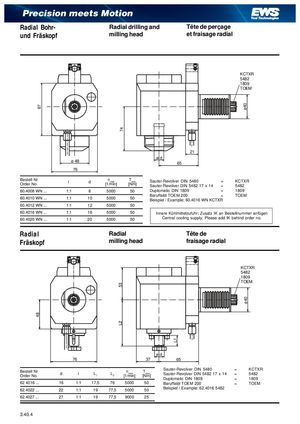 8748 7453L2 L1 ø40ø40 Precision meets Motion Radial Bohr- Radial drilling and Tête de perçage und Fräskopf milling head et fraisage radial KCTXR 5482 1809 TOEM 21 ød ø 48 65 76 Bestell NrOrder No. i d nmax Tmax Sauter-Revolver DIN 5480 = KCTXR[1/min][Nm]Sauter-Revolver DIN 5482 17 x 14=5482 60.4008 WN ... 1:1 8 5000 50 Duplomatic DIN 1809 = 1809 60.4010 WN ... 1:1 10 5000 50 Baruffaldi TOEM 200 = TOEMBeispiel / Example: 60.4016 WN KCTXR 60.4012 WN ... 1:1 12 5000 50 60.4016 WN ... 1:1 16 5000 50 Innere Kühlmittelzufuhr; Zusatz IK an Bestellnummer anfügen 60.4020 WN ... 1:1 20 5000 50 Central cooling supply; Please add IK behind order no. Radial Radial Tête de Fräskopf milling head fraisage radial KCTXR 5482 1809 TOEM ød 76 37 65 Bestell NrOrder No. d i L1 L2 nmax Tmax[1/min][Nm]Sauter-Revolver DIN 5480 =Sauter-Revolver DIN 5482 17 x 14=KCTXR5482 Duplomatic DIN 1809 = 1809 62 4016 ... 16 1:1 17,5 76 5000 50 Baruffaldi TOEM 200 = TOEM 62.4022 ... 22 1:1 19 77,5 5000 50 Beispiel / Example: 62.4016 5482 62.4027 ... 27 1:1 19 77,5 9000 25 3.40.4