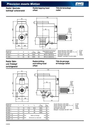 99,538 14 L114 L2 ø40 ø40 Precision meets Motion Radial Gewinde- Radial tapping head Tête de taraudage bohrkopf achsversetzt offset radial 128 39 CTXR5482 1809 TOEM ød 90 Bestell NrOrder No. i d L1 nmax Tmax Gewindebohraufnahme[1/min][Nm]Tapping adaptorSauter-Revolver DIN 5480=CTXRSauter-Revolver DIN 5482 17 x 14 =5482 Duplomatic DIN 1809 = 1809 81.4012 ... 1:1 36 45 5000 50 WFLK 1 (M3-M10) Baruffaldi TOEM 200 = TOEM 81.4020 ... 1:1 53 68 5000 50 WFLK 2 (M8-M12) Beispiel / Example: 81.4012 5482 Radial Bohr- Radial drilling Tête de perçage und Fräskopf and milling head et fraisage radial zurückgesetzt offset 128 55 39 CTXR5482 1809 TOEM ød (38) (38) 76 90 Bestell NrOrder No. i d L1 L2 nmax Tmax[1/min][Nm] Sauter-Revolver DIN 5480 = CTXRSauter-Revolver DIN 5482 17 x 14 =5482 Duplomatic DIN 1809 = 1809 82.4016 ... 1:1 16 17,5 28,5 5000 50 Baruffaldi TOEM 200 = TOEM 82.4022 ... 1:1 22 19 30 5000 50 Beispiel / Example: 82.4027 1809 82.4027 ... 1:1 27 19 30 5000 50 82.4016 .../3 3:1 16 120 Maße auf Anfrage 82.4022 .../3 3:1 22 120 Dimensions sur demande 82.4027 .../3 3:1 27 120 3.40.6