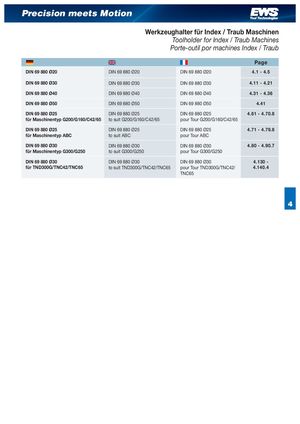 Precision meets Motion Werkzeughalter für Index / Traub Maschinen Toolholder for Index / Traub Machines Porte-outil por machines Index / Traub Page DIN 69 880 Ø20 DIN 69 880 Ø20 DIN 69 880 Ø20 4.1 - 4.5 DIN 69 880 Ø30 DIN 69 880 Ø30 DIN 69 880 Ø30 4.11 - 4.21 DIN 69 880 Ø40 DIN 69 880 Ø40 DIN 69 880 Ø40 4.31 - 4.36 DIN 69 880 Ø50 DIN 69 880 Ø50 DIN 69 880 Ø50 4.41 DIN 69 880 Ø25 DIN 69 880 Ø25 DIN 69 880 Ø25 4.61 - 4.70.8 für Maschinentyp G200/G160/C42/65 to suit G200/G160/C42/65 pour Tour G200/G160/C42/65 DIN 69 880 Ø25 DIN 69 880 Ø25 DIN 69 880 Ø25 4.71 - 4.79.8 für Maschinentyp ABC to suit ABC pour Tour ABC DIN 69 880 Ø30 DIN 69 880 Ø30 DIN 69 880 Ø30 4.80 - 4.90.7 für Maschinentyp G300/G250 to suit G300/G250 pour Tour G300/G250 DIN 69 880 Ø30 DIN 69 880 Ø30 DIN 69 880 Ø30 4.130 - für TND300G/TNC42/TNC65 to suit TND300G/TNC42/TNC65 pour Tour TND300G/TNC42/ 4.140.4 TNC65 4