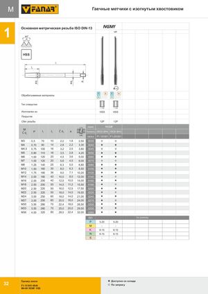 d1 d2 a M Гаечные метчики с изогнутым хвостовиком Основная метрическая резьба ISO DIN-13 NGMf 1 HS6S0E0 LH P PM HSS l1 l2 LH P M K P M K Обрабатываемые материалы N S H N S H Тип отверстия < 1,5d < 1,5d Изготовлен из HSS HSS Покрытие Сбег резьбы 12P 12P норма NGMf M Ćd P l1 l2 Ć d2 a Точность ISO2 (6H) ISO2 (6H) 1 INDEX F1-151001 F1-251001 M3 0,5 70 10 2,2 1,8 2,50 0030 M4 0,70 90 14 2,8 2,2 3,30 0040 M4,5 0,75 100 16 3,2 2,5 3,80 0045 M5 0,80 110 16 3,5 2,8 4,20 0050 M6 1,00 120 20 4,5 3,6 5,00 0060 M7 1,00 120 20 5,6 4,5 6,00 0070 M8 1,25 140 25 6,3 5,0 6,80 0080 M10 1,50 160 30 8,0 6,3 8,50 0100 M12 1,75 180 36 9,0 7,1 10,20 0120 M14 2,00 180 40 10,0 8,0 12,00 0140 M16 2,00 200 40 12,5 10,0 14,00 0160 M18 2,50 200 50 14,0 11,2 15,50 0180 M20 2,50 220 50 16,0 12,5 17,50 0200 M22 2,50 220 50 18,0 14,0 19,50 0220 M24 3,00 250 60 18,0 14,0 21,00 0240 M27 3,00 250 60 20,0 16,0 24,00 0270 M30 3,50 280 70 22,4 18,0 26,50 0300 M33 3,50 280 70 25,0 20,0 29,50 0330 M36 4,00 320 80 28,0 22,4 32,00 0360 ISO Vc (m/min) P 5-20 5-20 M - - K 6-15 6-15 N 6-15 6-15 S - - Пример заказа Доступнo со склада 32 F1-151001-0040 По запросу M4-6H NGMf HSS