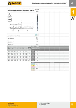d3 d1 d2 a Комбинированные метчики (метчики-сверла) M KOMBI Основная метрическая резьба ISO DIN-13 D-R30HS6S0E0 1 P PM HSS l1 l3 l2 P M K Обрабатываемые материалы N S H Тип отверстия < 1,5d Изготовлен из HSS Покрытие - Сбег резьбы D/4P норма KOMBI M Ćd P l1 l2 l 3 Ć d2 a Точность ISO2 (6H) 1 INDEX G1-051001 M3 0,50 56 11 16 3 2,4 2,5 0030 M4 0,70 63 14 18 4 3,0 3,3 0040 M5 0,80 71 18 20 5 3,8 4,2 0050 M6 1,00 80 22 22 6 4,9 5,0 0060 M8 1,25 95 25 26 8 6,2 6,8 0080 M 10 1,50 106 31 30 10 8,0 8,5 0100 M 12 1,75 115 35 32 12 9,0 10,2 0120 ISO Vc (m/min) P 5-15 M - K - N 6-15 S - Пример заказа Доступнo со склада G1-051001-0030 По запросу 33 M3-6H KOMBI D-R30 HSS