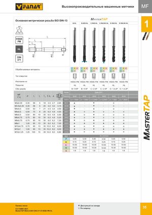 d1 d2 a MASTERTAP MASTERTAP MF Высокопроизводительные машинные метчики MMF Основная метрическая резьба ISO DIN-13 MASTERTAP HS6S0E0 B-HL B-IKR-HL C-R45-HL C-R45-IK-HL E-R45-HL E-R45-IK-HL 1 P PM HSSE l1 HPSMSE PM l3 l2 HL DIN 371 P M K P M K P M K P M K P M K P M K Обрабатываемые материалы N S H N S H N S H N S H N S H N S H Тип отверстия < 3d < 3d < 2,5d < 2,5d < 2,5d < 2,5d Изготовлен из HSSE-PM HSSE-PM HSSE-PM HSSE-PM HSSE-PM HSSE-PM Покрытие HL HL HL HL HL HL Сбег резьбы B / 4-5P B / 4-5P C / 2-3P C / 2-3P E / 1,5-2P E / 1,5-2P Норма DIN-371 MF Ćd PToleranclj1a l2 l 3 Ć d2 a Точность 6HX 6HX 6HX 6HX 6HX 6HX 1 INDEX C4-118M01 C4-118M61 C4-528M01 C4-528M51 C4-718M01 C4-718M51 M3x0,35 0,35 56 5 18 3,5 2,7 2,65 0031 - - - M3,5x0,35 0,35 56 5 20 4,0 3,0 3,15 0036 - - - M4x0,5 0,50 63 7 21 4,5 3,4 3,50 0041 - - - M5x0,5 0,50 70 8 25 6,0 4,9 4,50 0051 M6x0,5 0,50 80 10 30 6,0 4,9 5,50 0061 M6x0,75 0,75 80 10 30 6,0 4,9 5,20 0062 M8x0,75 0,75 80 10 30 8,0 6,2 7,20 0082 Tolerancja M8x1 1,00 90 13 35 8,0 6,2 7,00 0083 M10x0,75 0,75 90 13 35 10,0 8,0 9,20 0102 M10x1 1,00 90 13 35 10,0 8,0 9,00 0103 M10x1,25 1,25 100 15 39 10,0 8,0 8,80 0104 ISO Vc (m/min) P 5-40 5-50 5-40 5-50 5-40 5-50 M 5-15 5-25 5-15 5-25 5-15 5-25 K 10-30 10-50 10-30 10-50 10-30 10-50 N 10-30 10-50 10-30 10-50 10-30 10-50 S 1-8 1-8 1-8 1-8 1-8 1-8 Пример заказа Доступный со склада C4-118M01-0041 По запросу 35 MasterTAP M4x0,5-6HX DIN-371 B HSSE-PM HL