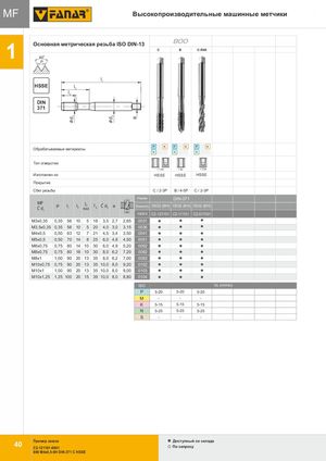d1 d2 a MF Высокопроизводительные машинные метчики MF Основная метрическая резьба ISO DIN-13 800 1 HS6S0E0 C B C-R40 P PM l1 HSSE l3 l2 DIN 371 P M K P M K P M K Обрабатываемые материалы N S H N S H N S H Тип отверстия < 1.5d < 3d < 2,5d Изготовлен из HSSE HSSE HSSE Покрытие Сбег резьбы C / 2-3P B / 4-5P C / 2-3P Норма DIN-371 MFĆd1 PToleral1ncja l2 l2R40 l 3 Ć d2 a Точность ISO2 (6H) ISO2 (6H) ISO2 (6H) INDEX C2-121101 C2-111101 C2-511101 M3x0,35 0,35 56 10 5 18 3,5 2,7 2,65 0031 M3,5x0,35 0,35 56 10 5 20 4,0 3,0 3,15 0036 M4x0,5 0,50 63 12 7 21 4,5 3,4 3,50 0041 M5x0,5 0,50 70 14 8 25 6,0 4,9 4,50 0051 M6x0,75 0,75 80 14 10 30 6,0 4,9 5,20 0062 M8x0,75 0,75 80 18 10 30 8,0 6,2 7,20 0082 M8x1 1,00 90 20 13 35 8,0 6,2 7,00 0083 Tolerancja M10x0,75 0,75 90 20 13 35 10,0 8,0 9,20 0102 M10x1 1,00 90 20 13 35 10,0 8,0 9,00 0103 M10x1,25 1,25 100 20 15 39 10,0 8,0 8,80 0104 ISO Vc (m/min) P 5-20 5-20 5-20 M - - - K 5-15 5-15 5-15 N 5-25 5-25 5-25 S - - - Пример заказа Доступный со склада 40 C2-121101-0041 По запросу 800 M4x0,5-6H DIN-371 C HSSE
