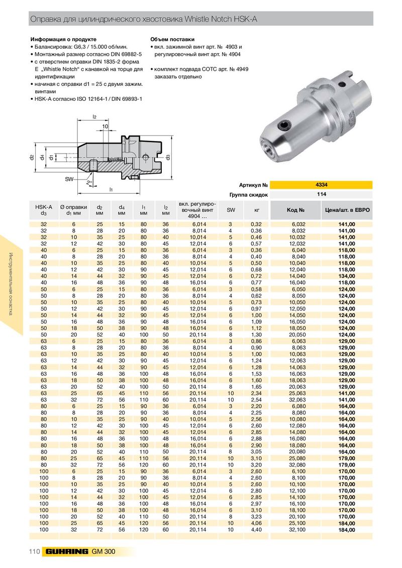 Оправка для цилиндрического хвостовика Whistle Notch HSK-A Информация о продукте Объем поставки • Балансировка: G6,3 / 15.000 об/мин. • вкл. зажимной винт арт. № 4903 и • Монтажный размер согласно DIN 69882-5 регулировочный винт арт. № 4904 • с отверстием оправки DIN 1835-2 форма Е „Whistle Notch“ с канавкой на торце для • комплект подвада СОТС арт. № 4949 идентификации заказать отдельно • начиная с оправки d1 = 25 с двумя зажим. винтами • HSK-A согласно ISO 12164-1 / DIN 69893-1 l2 10 d2 d4 d1 d3 SW 2° Артикул № 4334 l1 Группа скидок 114 вкл. регулиро- HSK-A Ø оправки d 2 d 4 l 1 l 2 вочный винт SW кг Код № Цена/шт. в ЕВРО d 3 d 1 мм мм мм мм мм 4904 … 32 6 25 15 80 36 6,014 3 0,32 6,032 141,00 32 8 28 20 80 36 8,014 4 0,36 8,032 141,00 32 10 35 25 80 40 10,014 5 0,46 10,032 141,00 32 12 42 30 80 45 12,014 6 0,57 12,032 141,00 Инструментальная оснастка 40 6 25 15 80 36 6,014 3 0,36 6,040 118,00 40 8 28 20 80 36 8,014 4 0,40 8,040 118,00 40 10 35 25 80 40 10,014 5 0,50 10,040 118,00 40 12 42 30 90 45 12,014 6 0,68 12,040 118,00 40 14 44 32 90 45 12,014 6 0,72 14,040 134,00 40 16 48 36 90 48 16,014 6 0,77 16,040 118,00 50 6 25 15 80 36 6,014 3 0,58 6,050 124,00 50 8 28 20 80 36 8,014 4 0,62 8,050 124,00 50 10 35 25 80 40 10,014 5 0,73 10,050 124,00 50 12 42 30 90 45 12,014 6 0,97 12,050 124,00 50 14 44 32 90 45 12,014 6 1,00 14,050 124,00 50 16 48 36 90 48 16,014 6 1,09 16,050 124,00 50 18 50 38 90 48 16,014 6 1,12 18,050 124,00 50 20 52 40 100 50 20,114 8 1,30 20,050 124,00 63 6 25 15 80 36 6,014 3 0,86 6,063 129,00 63 8 28 20 80 36 8,014 4 0,90 8,063 129,00 63 10 35 25 80 40 10,014 5 1,00 10,063 129,00 63 12 42 30 90 45 12,014 6 1,24 12,063 129,00 63 14 44 32 90 45 12,014 6 1,28 14,063 129,00 63 16 48 36 100 48 16,014 6 1,53 16,063 129,00 63 18 50 38 100 48 16,014 6 1,60 18,063 129,00 63 20 52 40 100 50 20,114 8 1,65 20,063 129,00 63 25 65 45 110 56 20,114 10 2,34 25,063 141,00 63 32 72 56 110 60 20,114 10 2,54 32,063 141,00 80 6 25 15 90 36 6,014 3 2,20 6,080 164,00 80 8 28 20 90 36 8,014 4 2,25 8,080 164,00 80 10 35 25 90 40 10,014 5 2,56 10,080 164,00 80 12 42 30 100 45 12,014 6 2,60 12,080 164,00 80 14 44 32 100 45 12,014 6 2,85 14,080 164,00 80 16 48 36 100 48 16,014 6 2,88 16,080 164,00 80 18 50 38 100 48 16,014 6 2,90 18,080 164,00 80 20 52 40 110 50 20,114 8 3,05 20,080 164,00 80 25 65 45 110 56 20,114 10 3,10 25,080 179,00 80 32 72 56 120 60 20,114 10 3,20 32,080 179,00 100 6 25 15 90 36 6,014 3 2,60 6,100 170,00 100 8 28 20 90 36 8,014 4 2,60 8,100 170,00 100 10 35 25 90 40 10,014 5 2,60 10,100 170,00 100 12 42 30 100 45 12,014 6 2,80 12,100 170,00 100 14 44 32 100 45 12,014 6 2,85 14,100 170,00 100 16 48 36 100 48 16,014 6 2,97 16,100 170,00 100 18 50 38 100 48 16,014 6 3,10 18,100 170,00 100 20 52 40 110 50 20,114 8 3,23 20,100 170,00 100 25 65 45 120 56 20,114 10 4,06 25,100 184,00 100 32 72 56 120 60 20,114 10 4,40 32,100 184,00 110 GM 300