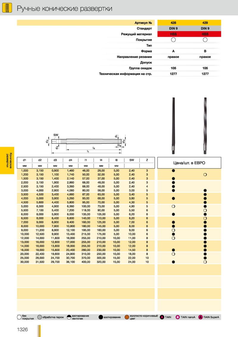 У Ручные конические развертки А ртикул Ns 42 8 429 С танд арт D IN 9 D IN 9 Р еж ущ и й материал П окры тие О О Тип Ф орм а А в Н аправление резания правое правое Д о п у с к Группа с к и д о к 105 105 Т ехническая инф орм ация на стр. 1277 1277 развертки Конические d1 d2 03 d4 I4 11 I6 s w I Z Цена/шт. в ЕВРО ММ ММ ММ ММ ММ ММ ММ 1,000 3,150 0,900 1,460 46,00 28,00 5,00 2,40 3 1,200 3,150 1,100 1,740 50,00 32,00 5,00 2,40 3 О 1,500 3,150 1,400 2,140 57,00 37,00 5,00 2,40 3 2,000 3,150 1,900 2,860 68,00 48,00 5,00 2,40 3 2,500 3,150 2,400 3,360 68,00 48,00 5,00 2,40 4 3,000 4,000 2,900 4,060 80,00 58,00 5,00 3,00 5 3,500 4,500 3,400 4,660 87,00 63,00 5,00 3,40 5 4,000 5,000 3,900 5,260 93,00 68,00 5,00 3,80 5 4,500 5,600 4,400 5,800 95,00 70,00 5,00 4,30 5 5,000 6,300 4,900 6,360 100,00 73,00 5,00 4,90 5 О 5,500 7,100 5,400 7,200 118,00 90,00 5,00 5,50 6 О 6,000 8,000 5,900 8,000 135,00 105,00 5,00 6,20 6 6,500 8,000 6,400 8,600 140,00 110,00 5,00 6,20 6 О 7,000 9,000 6,900 9,400 160,00 125,00 5,00 7,00 6 8,000 10,000 7,900 10,800 180,00 145,00 5,00 8,00 6 9,000 11,200 8,900 12,100 195,00 160,00 5,00 9,00 6 о 10,000 12,500 9,900 13,400 215,00 175,00 5,00 10,00 6 12,000 14,000 11,800 16,000 255,00 210,00 10,00 11,00 8 о 13,000 16,000 12,800 17,000 255,00 210,00 10,00 12,00 8 14,000 16,000 13,800 18,000 255,00 210,00 10,00 12,00 8 16,000 18,000 15,800 20,400 280,00 230,00 10,00 14,50 8 20,000 22,400 19,800 24,800 310,00 250,00 10,00 18,00 8 о 25,000 28,000 24,700 30,700 370,00 300,00 15,00 22,00 10 30,000 31,500 29,700 36,100 400,00 320,00 15,00 24,00 10 о без азотирование золотисто-коричневый О ( ^ ) обработка паром ) азотирование Q TiAIN ф TiAIN nanoA (A ) TiAIN SuperA покрытия ленточек О цвет 1 3 2 6