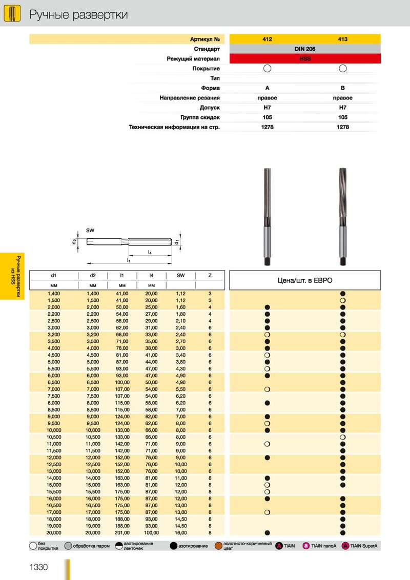 У Ручные развертки Артикул Ns 4 1 2 413 С танд арт D IN 206 Р еж ущ и й материал П окры тие О О Тип Ф орм а А В Н аправление резания правое правое Д о п у с к Н7 Н7 Группа с к и д о к 105 105 Т ехническая инф орм ация на стр. 1278 1278 SW Ручные развертки из HSS d1 d2 I4 Z '1 I SW I Цена/шт. в ЕВРО ММ ММ ММ ММ | | 1,400 1,400 41,00 20,00 1,12 3 • 1,500 1,500 41,00 20,00 1,12 3 о 2,000 2,000 50,00 25,00 1,60 4 • • 2,200 2,200 54,00 27,00 1,80 4 • • 2,500 2,500 58,00 29,00 2,10 4 • • 3,000 3,000 62,00 31,00 2,40 6 • • 3,200 3,200 66,00 33,00 2,40 6 О о 3,500 3,500 71,00 35,00 2,70 6 • • 4,000 4,000 76,00 38,00 3,00 6 • • 4,500 4,500 81,00 41,00 3,40 6 О • 5,000 5,000 87,00 44,00 3,80 6 • • 5,500 5,500 93,00 47,00 4,30 6 о • 6,000 6,000 93,00 47,00 4,90 6 • • 6,500 6,500 100,00 50,00 4,90 6 • 7,000 7,000 107,00 54,00 5,50 6 о • 7,500 7,500 107,00 54,00 6,20 6 • 8,000 8,000 115,00 58,00 6,20 6 • • 8,500 8,500 115,00 58,00 7,00 6 • 9,000 9,000 124,00 62,00 7,00 6 • • 9,500 9,500 124,00 62,00 8,00 6 о • 10,000 10,000 133,00 66,00 8,00 6 • • 10,500 10,500 133,00 66,00 8,00 6 о 11,000 11,000 142,00 71,00 9,00 6 о • 11,500 11,500 142,00 71,00 9,00 6 • 12,000 12,000 152,00 76,00 9,00 6 • • 12,500 12,500 152,00 76,00 10,00 6 • 13,000 13,000 152,00 76,00 10,00 6 • 14,000 14,000 163,00 81,00 11,00 8 • • 15,000 15,000 163,00 81,00 12,00 8 о • 15,500 15,500 175,00 87,00 12,00 8 о 16,000 16,000 175,00 87,00 12,00 8 • • 16,500 16,500 175,00 87,00 13,00 8 • 17,000 17,000 175,00 87,00 13,00 8 о • 18,000 18,000 188,00 93,00 14,50 8 • 19,000 19,000 188,00 93,00 14,50 8 • 20,000 20,000 201,00 100,00 16,00 8 • • без азотирование золотисто-коричневый О обработка паром |азотирование Q TiAIN ф TiAIN nanoA (A ) TiAIN SuperA покрытия ленточек О цвет 1 3 3 0