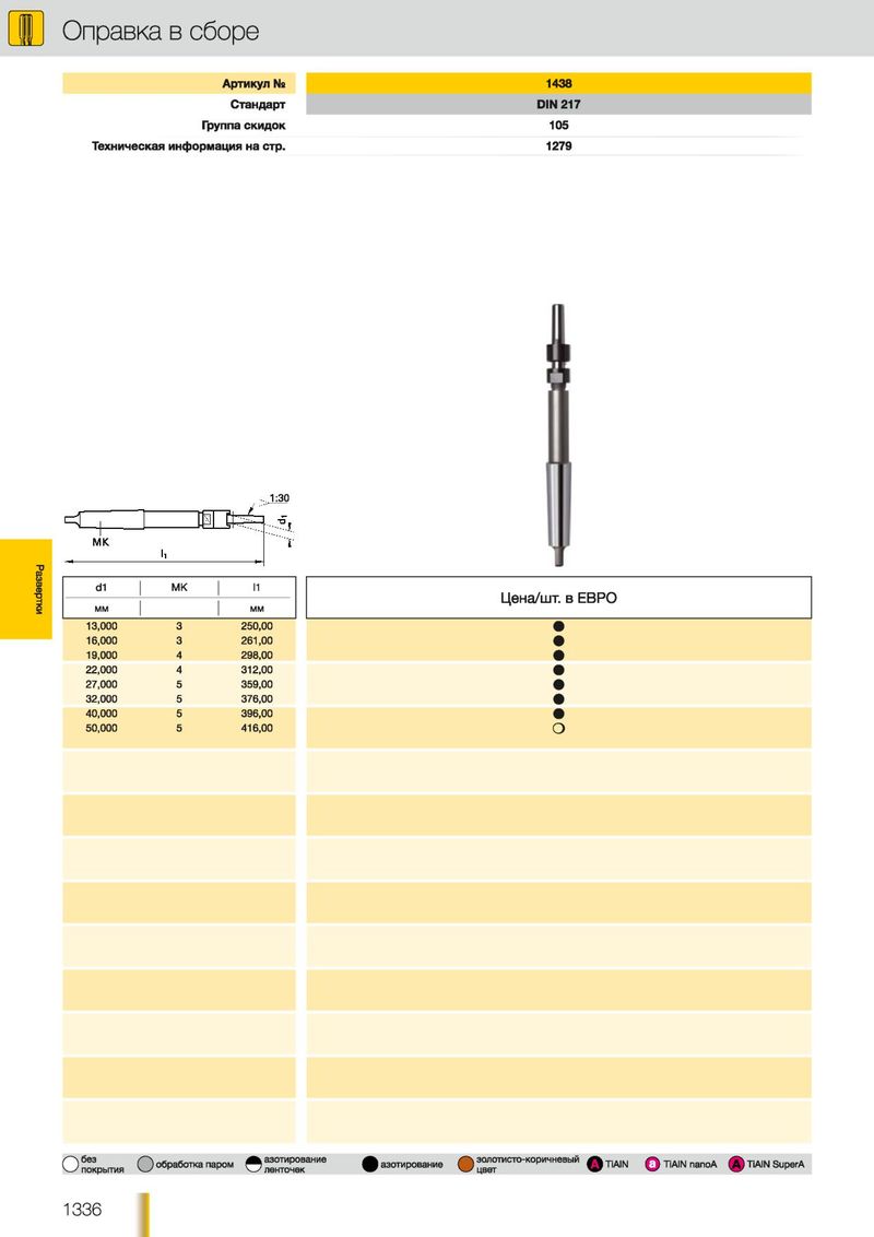 У Оправка в сборе А ртикул Ns 1438 С танд арт D IN 217 Группа с к и д о к 105 Техническая инф ормация на стр. 1279 1:30 Развертки d1 МК 11 Цена/шт. в ЕВРО ММ ММ 13,000 3 250,00 16,000 3 261,00 19,000 4 298,00 22,000 4 312,00 27,000 5 359,00 32,000 5 376,00 40,000 5 396,00 50,000 5 416,00 О без азотирование золотисто-коричневый О ( ^ ) обработка паром ) азотирование покрытия ленточек О Q TiAIN ф TiAIN nanoA (A ) TiAIN SuperA цвет 1 3 3 6