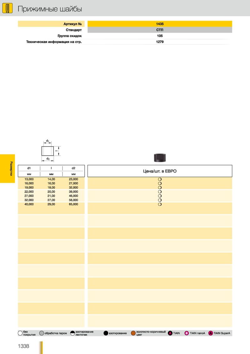 У Прижимные шайбы А ртикул Ns 1435 С танд арт стп Группа с к и д о к 105 Техническая инф ормация на стр. 1279 Развертки d1 I d2 Цена/шт. в ЕВРО ММ ММ ММ 13,000 14,00 23,000 О 16,000 16,00 27,000 О 19,000 18,00 32,000 о 22,000 20,00 39,000 о 27,000 21,00 46,000 о 32,000 27,00 56,000 о 40,000 29,00 65,000 о без азотирование золотисто-коричневый О ( ^ ) обработка паром ) азотирование покрытия ленточек О Q TiAIN ф TiAiN nanoA (A ) TiAIN SuperA цвет 1 3 3 8