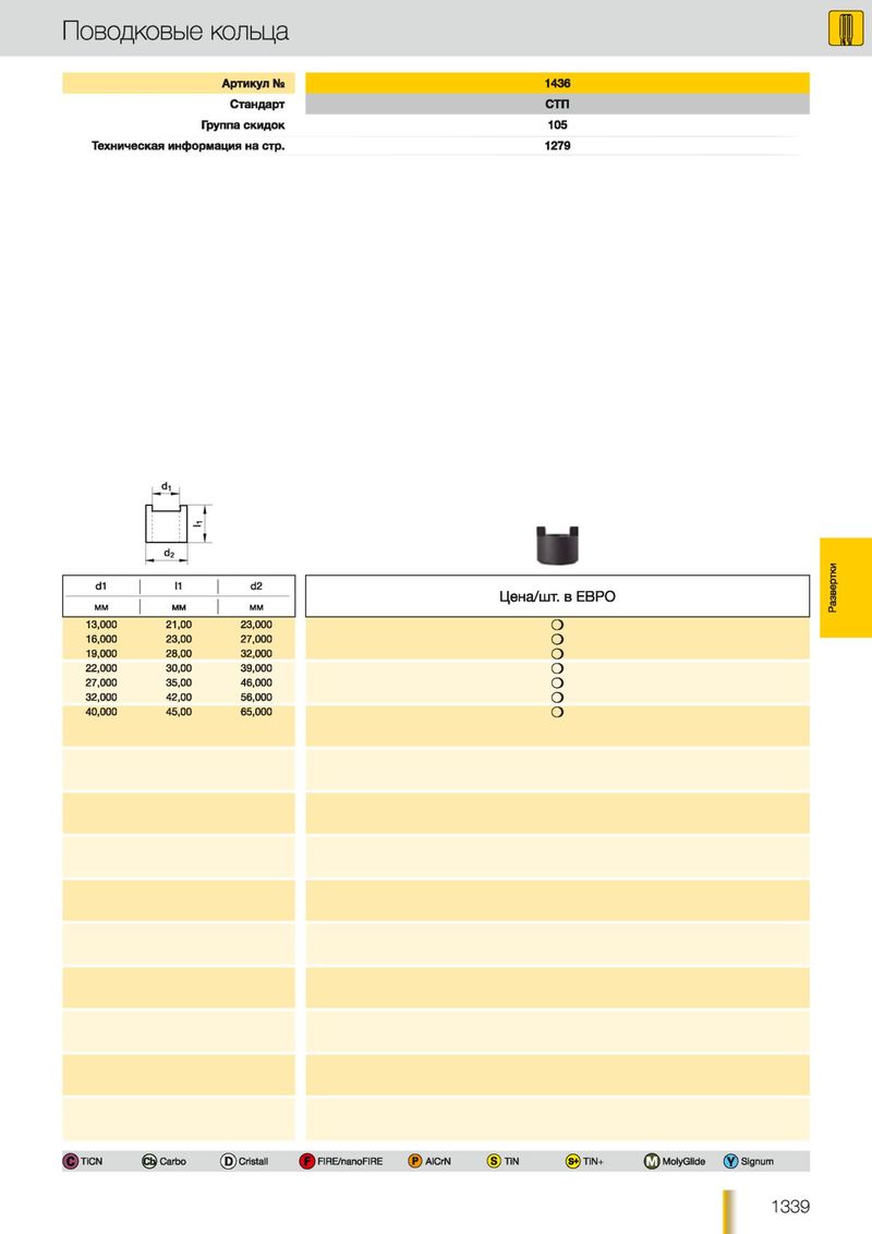 Поводковые кольца А р ти ку л Ns 1436 С та н д а р т С ТП Группа с к и д о к 105 Т е х н и ч е с ка я ин ф о рм ац и я н а с тр . 1279 di d2 d1 11 d2 Цена/шт. в ЕВРО ММ ММ ММ Развертки 13,000 21,00 23,000 О 16,000 23,00 27,000 О 19,000 28,00 32,000 О 22,000 30,00 39,000 о 27,000 35,00 46,000 о 32,000 42,00 56,000 о 40,000 45,00 65,000 о (С ) TiCN ) Carbo (В) Cristall ф FIRE/nanoFIRE (Р ) AlCrN (S ) TiN @ TiN+ | J ) MolyGlide ( J ) Signum 1 3 3 9