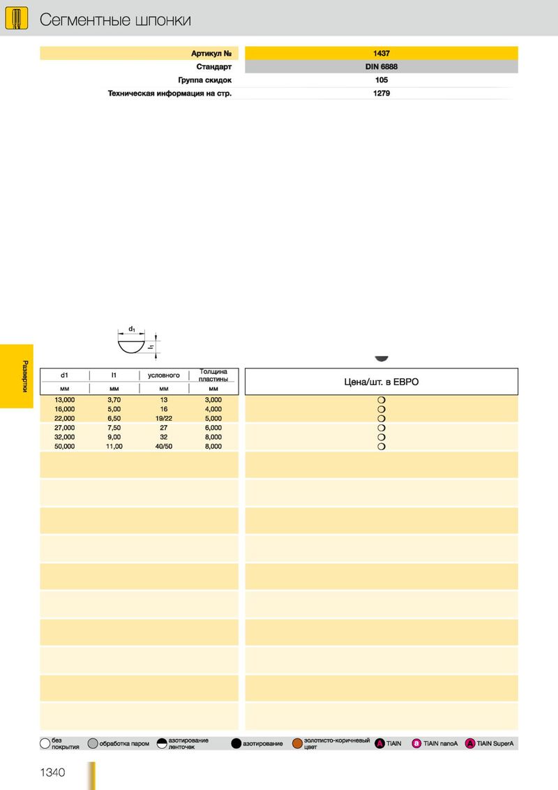 Сегментные шпонки А р ти ку л № 1437 С та н д а р т D IN 6 8 8 8 Группа с к и д о к 1 05 Т е х н и ч е с ка я и н ф о рм ац и я н а с тр . 1 279 Развертки Толщина d1 11 | условного пластины ММ М М м м мм 13,000 3,70 13 3,000 16,000 5,00 16 4,000 22,000 6,50 19/22 5,000 27,000 7,50 27 6,000 32,000 9,00 32 8,000 50,000 11,00 40/50 8,000 без азотирование золотисто-коричневый О ( ^ ) обработка паром ) азотирование покрытия ленточек О Q TiAIN ф TiAiN nanoA (A ) TiAIN SuperA цвет 1 3 4 0