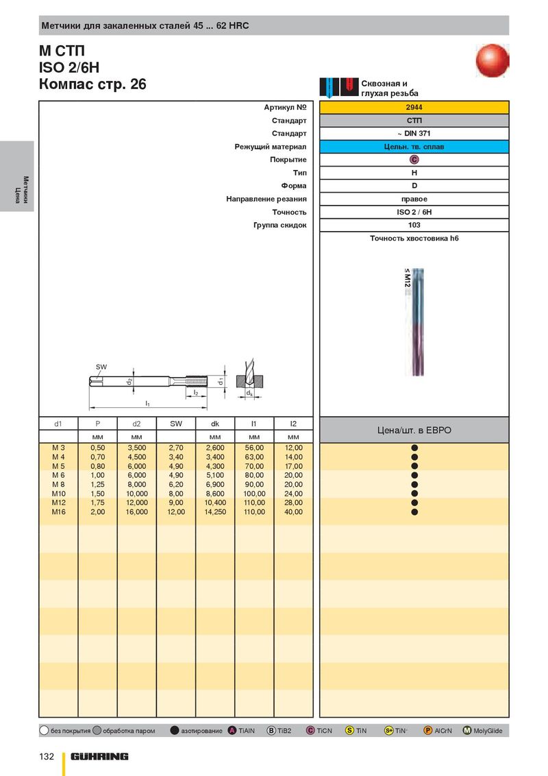 Метчики для закаленных сталей 45 ... 62 HRC M СТП ISO 2/6H Сквозная и Компас стр. 26 глухая резьба Артикул № 2944 Стандарт СТП Стандарт ~ DIN 371 Режущий материал Цельн. тв. сплав Покрытие Метчики Тип H Цена Форма D Направление резания правое Точность ISO 2 / 6H Группа скидок 103 Точность хвостовика h6 SW 2 1 d d l 2 d k l 1 d1 P d2 SW dk l1 l2 Цена/шт. в ЕВРО мм мм мм мм мм M 3 0,50 3,500 2,70 2,600 56,00 12,00 ● M 4 0,70 4,500 3,40 3,400 63,00 14,00 ● M 5 0,80 6,000 4,90 4,300 70,00 17,00 ● M 6 1,00 6,000 4,90 5,100 80,00 20,00 ● M 8 1,25 8,000 6,20 6,900 90,00 20,00 ● M10 1,50 10,000 8,00 8,600 100,00 24,00 ● M12 1,75 12,000 9,00 10,400 110,00 28,00 ● M16 2,00 16,000 12,00 14,250 110,00 40,00 ● без покрытия обработка паром азотирование TiAlN TiB2 TiCN TiN TiN + AlCrN MolyGlide 132