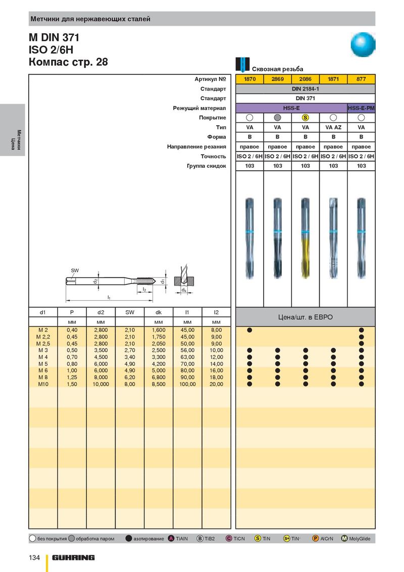 Метчики для нержавеющих сталей M DIN 371 ISO 2/6H Компас стр. 28 Сквозная резьба Артикул № 1870 2869 2086 1871 877 Стандарт DIN 2184-1 Стандарт DIN 371 Режущий материал HSS-E HSS-E-PM Покрытие Метчики Тип VA VA VA VA AZ VA Цена Форма B B B B B Направление резания правое правое правое правое правое Точность ISO 2 / 6H ISO 2 / 6H ISO 2 / 6H ISO 2 / 6H ISO 2 / 6H Группа скидок 103 103 103 103 103 SW 2 1 d d l 2 d k l 1 d1 P d2 SW dk l1 l2 Цена/шт. в ЕВРО мм мм мм мм мм M 2 0,40 2,800 2,10 1,600 45,00 8,00 ● ● M 2,2 0,45 2,800 2,10 1,750 45,00 9,00 ● M 2,5 0,45 2,800 2,10 2,050 50,00 9,00 ● M 3 0,50 3,500 2,70 2,500 56,00 10,00 ● ● ● ● ● M 4 0,70 4,500 3,40 3,300 63,00 12,00 ● ● ● ● ● M 5 0,80 6,000 4,90 4,200 70,00 14,00 ● ● ● ● ● M 6 1,00 6,000 4,90 5,000 80,00 16,00 ● ● ● ● ● M 8 1,25 8,000 6,20 6,800 90,00 18,00 ● ● ● ● ● M10 1,50 10,000 8,00 8,500 100,00 20,00 ● ● ● ● ● без покрытия обработка паром азотирование TiAlN TiB2 TiCN TiN TiN + AlCrN MolyGlide 134
