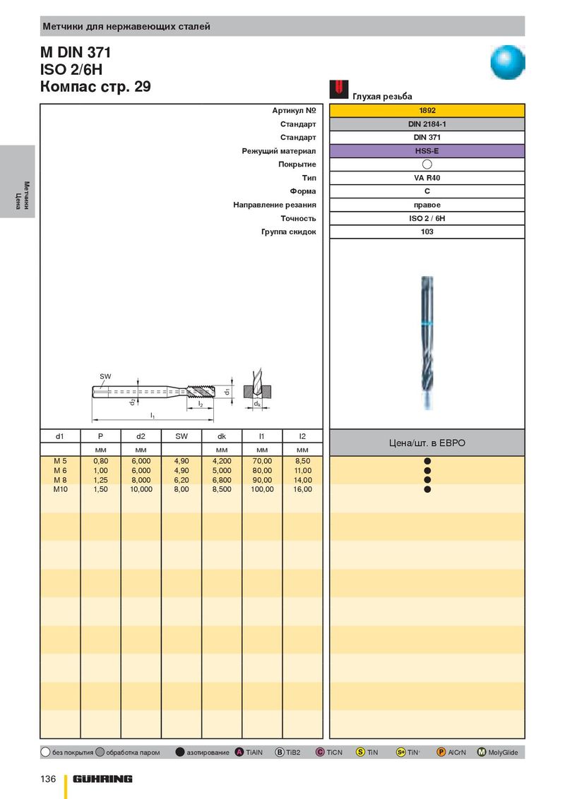 Метчики для нержавеющих сталей M DIN 371 ISO 2/6H Компас стр. 29 Глухая резьба Артикул № 1892 Стандарт DIN 2184-1 Стандарт DIN 371 Режущий материал HSS-E Покрытие Метчики Тип VA R40 Цена Форма C Направление резания правое Точность ISO 2 / 6H Группа скидок 103 SW 1 d 2 d l 2 d k l 1 d1 P d2 SW dk l1 l2 Цена/шт. в ЕВРО мм мм мм мм мм M 5 0,80 6,000 4,90 4,200 70,00 8,50 ● M 6 1,00 6,000 4,90 5,000 80,00 11,00 ● M 8 1,25 8,000 6,20 6,800 90,00 14,00 ● M10 1,50 10,000 8,00 8,500 100,00 16,00 ● без покрытия обработка паром азотирование TiAlN TiB2 TiCN TiN TiN + AlCrN MolyGlide 136