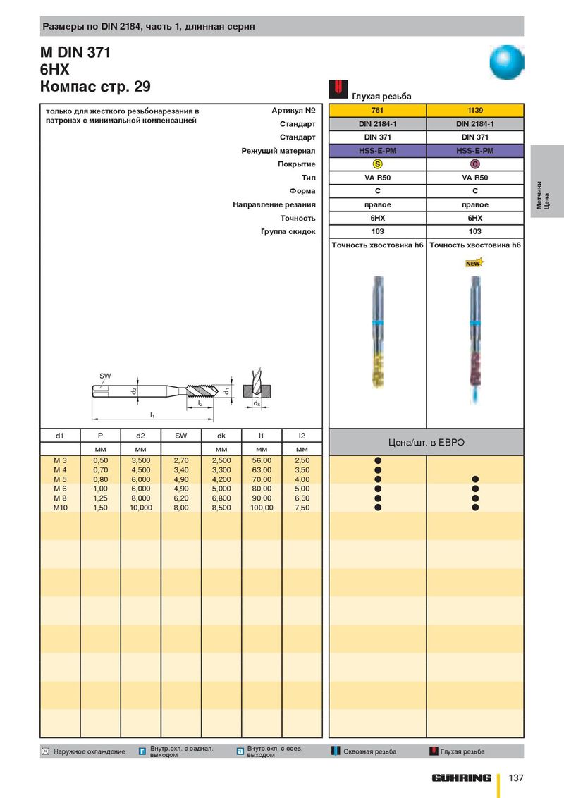Размеры по DIN 2184, часть 1, длинная серия M DIN 371 6HX Компас стр. 29 Глухая резьба только для жесткого резьбонарезания в Артикул № 761 1139 патронах с минимальной компенсацией Стандарт DIN 2184-1 DIN 2184-1 Стандарт DIN 371 DIN 371 Режущий материал HSS-E-PM HSS-E-PM Покрытие Тип VA R50 VA R50 Форма C C Направление резания правое правое Метчики Цена Точность 6HX 6HX Группа скидок 103 103 Точность хвостовика h6 Точность хвостовика h6 SW 2 1 d d l 2 d k l 1 d1 P d2 SW dk l1 l2 Цена/шт. в ЕВРО мм мм мм мм мм M 3 0,50 3,500 2,70 2,500 56,00 2,50 ● M 4 0,70 4,500 3,40 3,300 63,00 3,50 ● M 5 0,80 6,000 4,90 4,200 70,00 4,00 ● ● M 6 1,00 6,000 4,90 5,000 80,00 5,00 ● ● M 8 1,25 8,000 6,20 6,800 90,00 6,30 ● ● M10 1,50 10,000 8,00 8,500 100,00 7,50 ● ● Внутр.охл. с радиал. Внутр.охл. с осев. Наружное охлаждение Сквозная резьба Глухая резьба выходом выходом 137