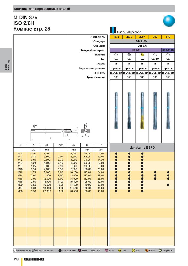 Метчики для нержавеющих сталей M DIN 376 ISO 2/6H Компас стр. 28 Сквозная резьба Артикул № 1872 2870 2087 792 879 Стандарт DIN 2184-1 Стандарт DIN 376 Режущий материал HSS-E HSS-E-PM Покрытие Метчики Тип VA VA VA VA AZ VA Цена Форма B B B B B Направление резания правое правое правое правое правое Точность ISO 2 / 6H ISO 2 / 6H ISO 2 / 6H ISO 2 / 6H ISO 2 / 6H Группа скидок 103 103 103 103 103 SW 2 1 d d l 2 d k l 1 d1 P d2 SW dk l1 l2 Цена/шт. в ЕВРО мм мм мм мм мм M 3 0,50 2,200 2,500 56,00 10,00 ● ● ● M 4 0,70 2,800 2,10 3,300 63,00 12,00 ● ● ● M 5 0,80 3,500 2,70 4,200 70,00 14,00 ● ● ● M 6 1,00 4,500 3,40 5,000 80,00 16,00 ● ● ● M 8 1,25 6,000 4,90 6,800 90,00 18,00 ● ● ● M10 1,50 7,000 5,50 8,500 100,00 20,00 ● ● ● M12 1,75 9,000 7,00 10,200 110,00 24,00 ● ● ● ● ● M14 2,00 11,000 9,00 12,000 110,00 26,00 ● ● ● ● ● M16 2,00 12,000 9,00 14,000 110,00 26,00 ● ● ● ● ● M18 2,50 14,000 11,00 15,500 125,00 30,00 ● ● ● M20 2,50 16,000 12,00 17,500 140,00 32,00 ● ● ● ● M24 3,00 18,000 14,50 21,000 160,00 36,00 ● ● ● M30 3,50 22,000 18,00 26,500 180,00 40,00 ● ● ● без покрытия обработка паром азотирование TiAlN TiB2 TiCN TiN TiN + AlCrN MolyGlide 138