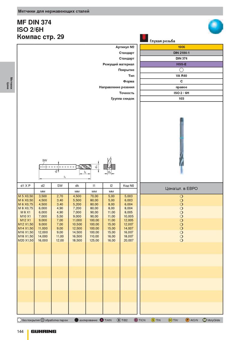 Метчики для нержавеющих сталей MF DIN 374 ISO 2/6H Компас стр. 29 Глухая резьба Артикул № 1906 Стандарт DIN 2184-1 Стандарт DIN 374 Режущий материал HSS-E Покрытие Метчики Тип VA R40 Цена Форма C Направление резания правое Точность ISO 2 / 6H Группа скидок 103 SW 1 d 2 d l 2 d k l 1 d1 X P d2 SW dk l1 l2 Код № Цена/шт. в ЕВРО мм мм мм мм M 5 X0,50 3,500 2,70 4,500 70,00 5,00 5,003 ❍ M 6 X0,50 4,500 3,40 5,500 80,00 5,00 6,003 ❍ M 6 X0,75 4,500 3,40 5,200 80,00 8,00 6,004 ❍ M 8 X0,75 6,000 4,90 7,200 80,00 8,00 8,004 ❍ M 8 X1 6,000 4,90 7,000 90,00 11,00 8,005 ❍ M10 X1 7,000 5,50 9,000 90,00 11,00 10,005 ❍ M12 X1 9,000 7,00 11,000 100,00 11,00 12,005 ❍ M12 X1,50 9,000 7,00 10,500 100,00 15,00 12,007 ❍ M14 X1,50 11,000 9,00 12,500 100,00 15,00 14,007 ❍ M16 X1,50 12,000 9,00 14,500 100,00 15,00 16,007 ❍ M18 X1,50 14,000 11,00 16,500 110,00 16,00 18,007 ❍ M20 X1,50 16,000 12,00 18,500 125,00 16,00 20,007 ❍ без покрытия обработка паром азотирование TiAlN TiB2 TiCN TiN TiN + AlCrN MolyGlide 144