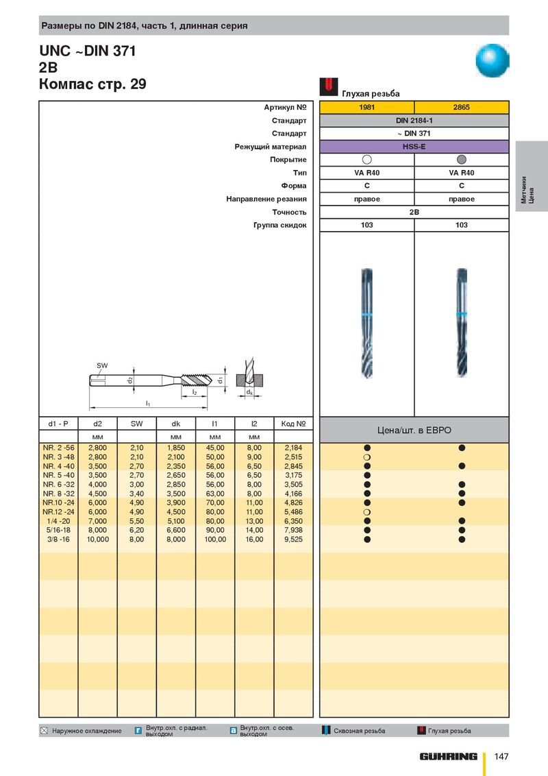 Размеры по DIN 2184, часть 1, длинная серия UNC ~DIN 371 2B Компас стр. 29 Глухая резьба Артикул № 1981 2865 Стандарт DIN 2184-1 Стандарт ~ DIN 371 Режущий материал HSS-E Покрытие Тип VA R40 VA R40 Форма C C Направление резания правое правое Метчики Цена Точность 2B Группа скидок 103 103 SW 2 1 d d l 2 d k l 1 d1 - P d2 SW dk l1 l2 Код № Цена/шт. в ЕВРО мм мм мм мм NR. 2 -56 2,800 2,10 1,850 45,00 8,00 2,184 ● ● NR. 3 -48 2,800 2,10 2,100 50,00 9,00 2,515 ❍ NR. 4 -40 3,500 2,70 2,350 56,00 6,50 2,845 ● ● NR. 5 -40 3,500 2,70 2,650 56,00 6,50 3,175 ● NR. 6 -32 4,000 3,00 2,850 56,00 8,00 3,505 ● ● NR. 8 -32 4,500 3,40 3,500 63,00 8,00 4,166 ● ● NR.10 -24 6,000 4,90 3,900 70,00 11,00 4,826 ● ● NR.12 -24 6,000 4,90 4,500 80,00 11,00 5,486 ❍ 1/4 -20 7,000 5,50 5,100 80,00 13,00 6,350 ● ● 5/16-18 8,000 6,20 6,600 90,00 14,00 7,938 ● ● 3/8 -16 10,000 8,00 8,000 100,00 16,00 9,525 ● ● Внутр.охл. с радиал. Внутр.охл. с осев. Наружное охлаждение Сквозная резьба Глухая резьба выходом выходом 147