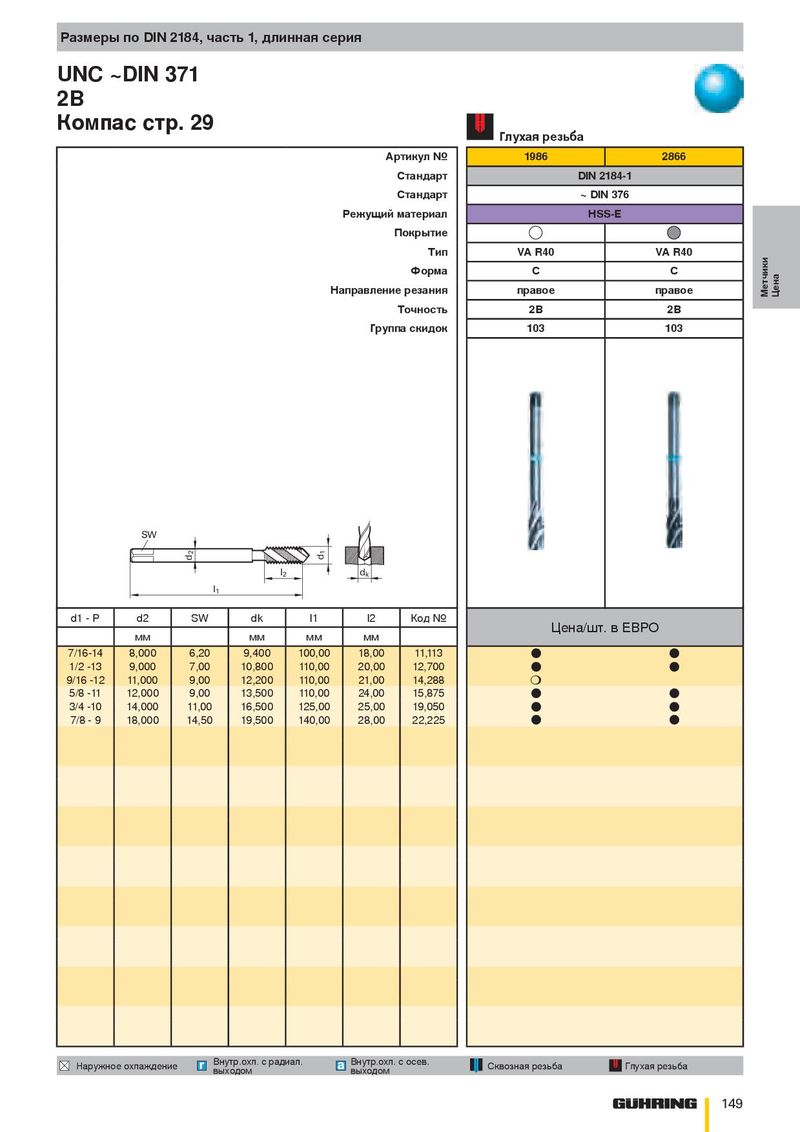 Размеры по DIN 2184, часть 1, длинная серия UNC ~DIN 371 2B Компас стр. 29 Глухая резьба Артикул № 1986 2866 Стандарт DIN 2184-1 Стандарт ~ DIN 376 Режущий материал HSS-E Покрытие Тип VA R40 VA R40 Форма C C Направление резания правое правое Метчики Цена Точность 2B 2B Группа скидок 103 103 SW 2 1 d d l 2 d k l 1 d1 - P d2 SW dk l1 l2 Код № Цена/шт. в ЕВРО мм мм мм мм 7/16-14 8,000 6,20 9,400 100,00 18,00 11,113 ● ● 1/2 -13 9,000 7,00 10,800 110,00 20,00 12,700 ● ● 9/16 -12 11,000 9,00 12,200 110,00 21,00 14,288 ❍ 5/8 -11 12,000 9,00 13,500 110,00 24,00 15,875 ● ● 3/4 -10 14,000 11,00 16,500 125,00 25,00 19,050 ● ● 7/8 - 9 18,000 14,50 19,500 140,00 28,00 22,225 ● ● Внутр.охл. с радиал. Внутр.охл. с осев. Наружное охлаждение Сквозная резьба Глухая резьба выходом выходом 149