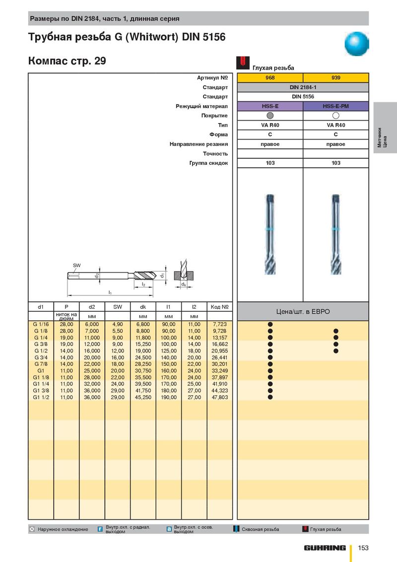 Размеры по DIN 2184, часть 1, длинная серия Трубная резьба G (Whitwort) DIN 5156 Компас стр. 29 Глухая резьба Артикул № 968 939 Стандарт DIN 2184-1 Стандарт DIN 5156 Режущий материал HSS-E HSS-E-PM Покрытие Тип VA R40 VA R40 Форма C C Направление резания правое правое Метчики Цена Точность Группа скидок 103 103 SW 2 1 d d l 2 d k l 1 d1 P d2 SW dk l1 l2 Код № Цена/шт. в ЕВРО ниток на мм мм мм мм дюйм G 1/16 28,00 6,000 4,90 6,800 90,00 11,00 7,723 ● G 1/8 28,00 7,000 5,50 8,800 90,00 11,00 9,728 ● ● G 1/4 19,00 11,000 9,00 11,800 100,00 14,00 13,157 ● ● G 3/8 19,00 12,000 9,00 15,250 100,00 14,00 16,662 ● ● G 1/2 14,00 16,000 12,00 19,000 125,00 18,00 20,955 ● ● G 3/4 14,00 20,000 16,00 24,500 140,00 20,00 26,441 ● G 7/8 14,00 22,000 18,00 28,250 150,00 22,00 30,201 ● G1 11,00 25,000 20,00 30,750 160,00 24,00 33,249 ● G1 1/8 11,00 28,000 22,00 35,500 170,00 24,00 37,897 ● G1 1/4 11,00 32,000 24,00 39,500 170,00 25,00 41,910 ● G1 3/8 11,00 36,000 29,00 41,750 180,00 27,00 44,323 ● G1 1/2 11,00 36,000 29,00 45,250 190,00 27,00 47,803 ● Внутр.охл. с радиал. Внутр.охл. с осев. Наружное охлаждение Сквозная резьба Глухая резьба выходом выходом 153
