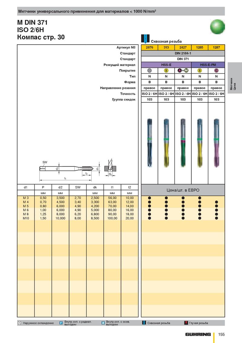 2 Метчики универсального применения для материалов < 1000 N/mm M DIN 371 ISO 2/6H Компас стр. 30 Сквозная резьба Артикул № 2876 313 2427 1285 1287 Стандарт DIN 2184-1 Стандарт DIN 371 Режущий материал HSS-E HSS-E-PM Покрытие Тип N N N N N Форма B B B B B Направление резания правое правое правое правое правое Метчики Цена Точность ISO 2 / 6H ISO 2 / 6H ISO 2 / 6H ISO 2 / 6H ISO 2 / 6H Группа скидок 103 103 103 103 103 SW 2 1 d d l 2 d k l 1 d1 P d2 SW dk l1 l2 Цена/шт. в ЕВРО мм мм мм мм мм M 3 0,50 3,500 2,70 2,500 56,00 10,00 ● ● ● ● M 4 0,70 4,500 3,40 3,300 63,00 12,00 ● ● ● ● ● M 5 0,80 6,000 4,90 4,200 70,00 14,00 ● ● ● ● ● M 6 1,00 6,000 4,90 5,000 80,00 16,00 ● ● ● ● ● M 8 1,25 8,000 6,20 6,800 90,00 18,00 ● ● ● ● ● M10 1,50 10,000 8,00 8,500 100,00 20,00 ● ● ● ● ● Внутр.охл. с радиал. Внутр.охл. с осев. Наружное охлаждение Сквозная резьба Глухая резьба выходом выходом 155