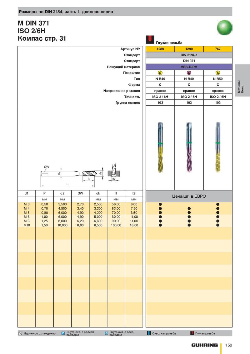 Размеры по DIN 2184, часть 1, длинная серия M DIN 371 ISO 2/6H Компас стр. 31 Глухая резьба Артикул № 1288 1290 767 Стандарт DIN 2184-1 Стандарт DIN 371 Режущий материал HSS-E-PM Покрытие Тип N R40 N R40 N R50 Форма C C C Направление резания правое правое правое Метчики Цена Точность ISO 2 / 6H ISO 2 / 6H ISO 2 / 6H Группа скидок 103 103 103 SW 2 1 d d l 2 d k l 1 d1 P d2 SW dk l1 l2 Цена/шт. в ЕВРО мм мм мм мм мм M 3 0,50 3,500 2,70 2,500 56,00 6,00 ● ● M 4 0,70 4,500 3,40 3,300 63,00 7,50 ● ● ● M 5 0,80 6,000 4,90 4,200 70,00 8,50 ● ● ● M 6 1,00 6,000 4,90 5,000 80,00 11,00 ● ● ● M 8 1,25 8,000 6,20 6,800 90,00 14,00 ● ● ● M10 1,50 10,000 8,00 8,500 100,00 16,00 ● ● ● Внутр.охл. с радиал. Внутр.охл. с осев. Наружное охлаждение Сквозная резьба Глухая резьба выходом выходом 159