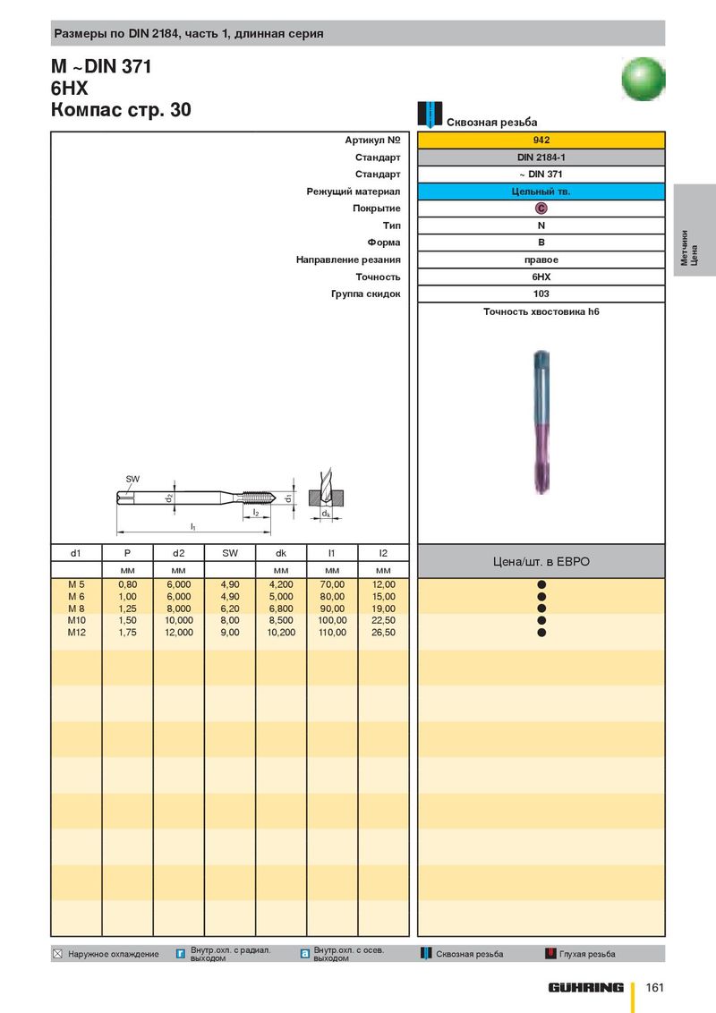 Размеры по DIN 2184, часть 1, длинная серия M ~DIN 371 6HX Компас стр. 30 Сквозная резьба Артикул № 942 Стандарт DIN 2184-1 Стандарт ~ DIN 371 Режущий материал Цельный тв. Покрытие Тип N Форма B Направление резания правое Метчики Цена Точность 6HX Группа скидок 103 Точность хвостовика h6 SW 2 1 d d l 2 d k l 1 d1 P d2 SW dk l1 l2 Цена/шт. в ЕВРО мм мм мм мм мм M 5 0,80 6,000 4,90 4,200 70,00 12,00 ● M 6 1,00 6,000 4,90 5,000 80,00 15,00 ● M 8 1,25 8,000 6,20 6,800 90,00 19,00 ● M10 1,50 10,000 8,00 8,500 100,00 22,50 ● M12 1,75 12,000 9,00 10,200 110,00 26,50 ● Внутр.охл. с радиал. Внутр.охл. с осев. Наружное охлаждение Сквозная резьба Глухая резьба выходом выходом 161