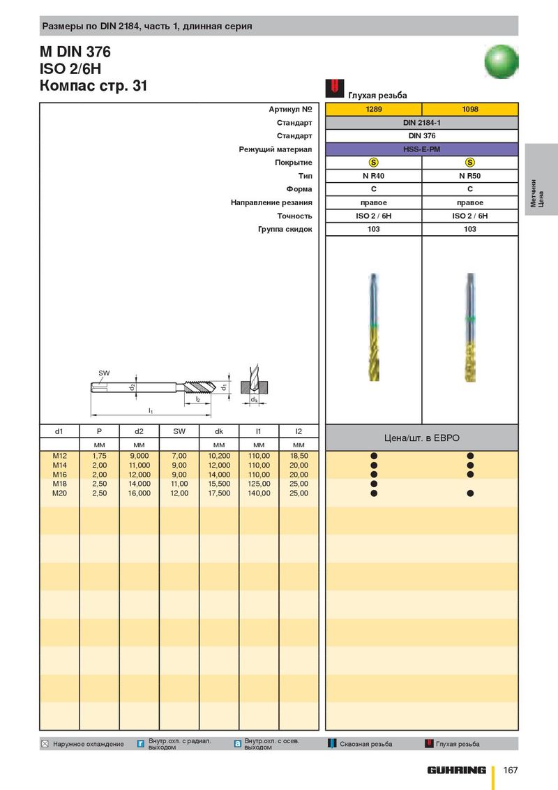 Размеры по DIN 2184, часть 1, длинная серия M DIN 376 ISO 2/6H Компас стр. 31 Глухая резьба Артикул № 1289 1098 Стандарт DIN 2184-1 Стандарт DIN 376 Режущий материал HSS-E-PM Покрытие Тип N R40 N R50 Форма C C Направление резания правое правое Метчики Цена Точность ISO 2 / 6H ISO 2 / 6H Группа скидок 103 103 SW 2 1 d d l 2 d k l 1 d1 P d2 SW dk l1 l2 Цена/шт. в ЕВРО мм мм мм мм мм M12 1,75 9,000 7,00 10,200 110,00 18,50 ● ● M14 2,00 11,000 9,00 12,000 110,00 20,00 ● ● M16 2,00 12,000 9,00 14,000 110,00 20,00 ● ● M18 2,50 14,000 11,00 15,500 125,00 25,00 ● M20 2,50 16,000 12,00 17,500 140,00 25,00 ● ● Внутр.охл. с радиал. Внутр.охл. с осев. Наружное охлаждение Сквозная резьба Глухая резьба выходом выходом 167