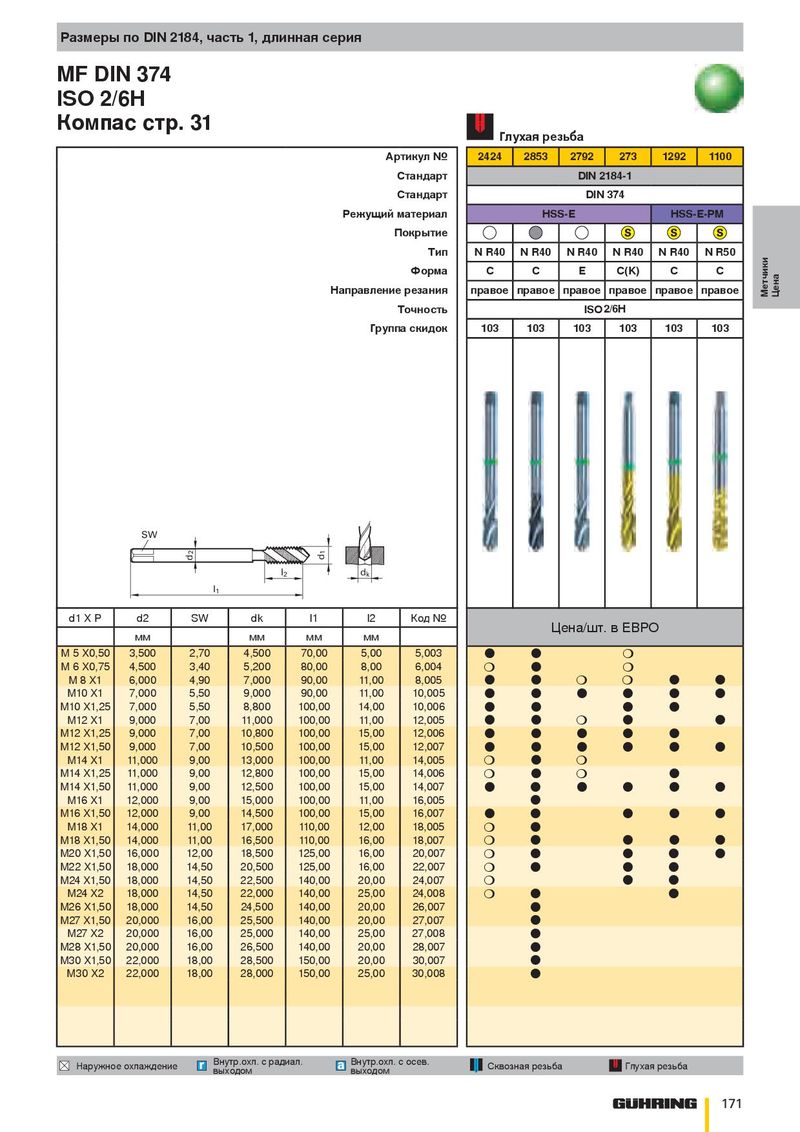 Размеры по DIN 2184, часть 1, длинная серия MF DIN 374 ISO 2/6H Компас стр. 31 Глухая резьба Артикул № 2424 2853 2792 273 1292 1100 Стандарт DIN 2184-1 Стандарт DIN 374 Режущий материал HSS-E HSS-E-PM Покрытие Тип N R40 N R40 N R40 N R40 N R40 N R50 Форма C C E C(K) C C Направление резания правое правое правое правое правое правое Метчики Цена Точность ISO 2/6H Группа скидок 103 103 103 103 103 103 SW 2 1 d d l 2 d k l 1 d1 X P d2 SW dk l1 l2 Код № Цена/шт. в ЕВРО мм мм мм мм M 5 X0,50 3,500 2,70 4,500 70,00 5,00 5,003 ● ● ❍ M 6 X0,75 4,500 3,40 5,200 80,00 8,00 6,004 ❍ ● ❍ M 8 X1 6,000 4,90 7,000 90,00 11,00 8,005 ● ● ❍ ❍ ● ● M10 X1 7,000 5,50 9,000 90,00 11,00 10,005 ● ● ● ● ● ● M10 X1,25 7,000 5,50 8,800 100,00 14,00 10,006 ● ● ● ● M12 X1 9,000 7,00 11,000 100,00 11,00 12,005 ● ● ❍ ● ● M12 X1,25 9,000 7,00 10,800 100,00 15,00 12,006 ● ● ● ● ● M12 X1,50 9,000 7,00 10,500 100,00 15,00 12,007 ● ● ● ● ● ● M14 X1 11,000 9,00 13,000 100,00 11,00 14,005 ❍ ● ❍ M14 X1,25 11,000 9,00 12,800 100,00 15,00 14,006 ❍ ● ❍ ● M14 X1,50 11,000 9,00 12,500 100,00 15,00 14,007 ● ● ● ● ● ● M16 X1 12,000 9,00 15,000 100,00 11,00 16,005 ● M16 X1,50 12,000 9,00 14,500 100,00 15,00 16,007 ● ● ● ● ● M18 X1 14,000 11,00 17,000 110,00 12,00 18,005 ❍ ● M18 X1,50 14,000 11,00 16,500 110,00 16,00 18,007 ❍ ● ● ● ● M20 X1,50 16,000 12,00 18,500 125,00 16,00 20,007 ❍ ● ● ● ● M22 X1,50 18,000 14,50 20,500 125,00 16,00 22,007 ❍ ● ● ● M24 X1,50 18,000 14,50 22,500 140,00 20,00 24,007 ❍ ● ● M24 X2 18,000 14,50 22,000 140,00 25,00 24,008 ❍ ● ● M26 X1,50 18,000 14,50 24,500 140,00 20,00 26,007 ● M27 X1,50 20,000 16,00 25,500 140,00 20,00 27,007 ● M27 X2 20,000 16,00 25,000 140,00 25,00 27,008 ● M28 X1,50 20,000 16,00 26,500 140,00 20,00 28,007 ● M30 X1,50 22,000 18,00 28,500 150,00 20,00 30,007 ● M30 X2 22,000 18,00 28,000 150,00 25,00 30,008 ● Внутр.охл. с радиал. Внутр.охл. с осев. Наружное охлаждение Сквозная резьба Глухая резьба выходом выходом 171