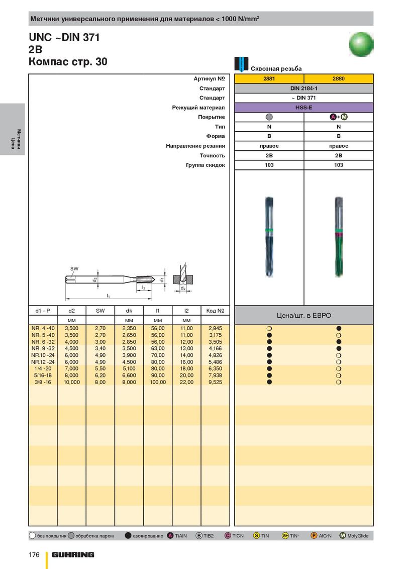 2 Метчики универсального применения для материалов < 1000 N/mm UNC ~DIN 371 2B Компас стр. 30 Сквозная резьба Артикул № 2881 2880 Стандарт DIN 2184-1 Стандарт ~ DIN 371 Режущий материал HSS-E Покрытие Метчики Тип N N Цена Форма B B Направление резания правое правое Точность 2B 2B Группа скидок 103 103 SW 2 1 d d l 2 d k l 1 d1 - P d2 SW dk l1 l2 Код № Цена/шт. в ЕВРО мм мм мм мм NR. 4 -40 3,500 2,70 2,350 56,00 11,00 2,845 ❍ ● NR. 5 -40 3,500 2,70 2,650 56,00 11,00 3,175 ● ❍ NR. 6 -32 4,000 3,00 2,850 56,00 12,00 3,505 ● ● NR. 8 -32 4,500 3,40 3,500 63,00 13,00 4,166 ● ● NR.10 -24 6,000 4,90 3,900 70,00 14,00 4,826 ● ❍ NR.12 -24 6,000 4,90 4,500 80,00 16,00 5,486 ● ❍ 1/4 -20 7,000 5,50 5,100 80,00 18,00 6,350 ● ❍ 5/16-18 8,000 6,20 6,600 90,00 20,00 7,938 ● ❍ 3/8 -16 10,000 8,00 8,000 100,00 22,00 9,525 ● ❍ без покрытия обработка паром азотирование TiAlN TiB2 TiCN TiN TiN + AlCrN MolyGlide 176