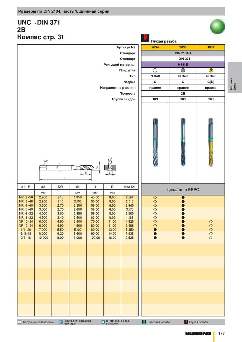 Размеры по DIN 2184, часть 1, длинная серия UNC ~DIN 371 2B Компас стр. 31 Глухая резьба Артикул № 2854 2855 1837 Стандарт DIN 2184-1 Стандарт ~ DIN 371 Режущий материал HSS-E Покрытие Тип N R40 N R40 N R40 Форма C C C(K) Направление резания правое правое правое Метчики Цена Точность 2B Группа скидок 103 103 103 SW 2 1 d d l 2 d k l 1 d1 - P d2 SW dk l1 l2 Код № Цена/шт. в ЕВРО мм мм мм мм NR. 2 -56 2,800 2,10 1,850 45,00 8,00 2,184 ❍ ● NR. 3 -48 2,800 2,10 2,100 50,00 9,00 2,515 ❍ ● NR. 4 -40 3,500 2,70 2,350 56,00 6,50 2,845 ❍ ● NR. 5 -40 3,500 2,70 2,650 56,00 6,50 3,175 ❍ ● NR. 6 -32 4,000 3,00 2,850 56,00 8,00 3,505 ❍ ● NR. 8 -32 4,500 3,40 3,500 63,00 8,00 4,166 ❍ ● NR.10 -24 6,000 4,90 3,900 70,00 11,00 4,826 ❍ ● ❍ NR.12 -24 6,000 4,90 4,500 80,00 11,00 5,486 ❍ ● ❍ 1/4 -20 7,000 5,50 5,100 80,00 13,00 6,350 ● ● ❍ 5/16-18 8,000 6,20 6,600 90,00 14,00 7,938 ● ● ❍ 3/8 -16 10,000 8,00 8,000 100,00 16,00 9,525 ● ● ❍ Внутр.охл. с радиал. Внутр.охл. с осев. Наружное охлаждение Сквозная резьба Глухая резьба выходом выходом 177