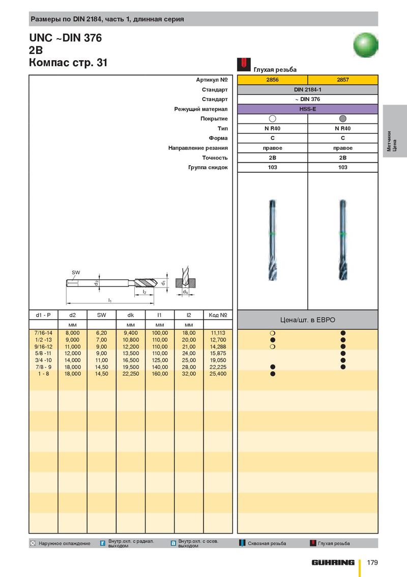 Размеры по DIN 2184, часть 1, длинная серия UNC ~DIN 376 2B Компас стр. 31 Глухая резьба Артикул № 2856 2857 Стандарт DIN 2184-1 Стандарт ~ DIN 376 Режущий материал HSS-E Покрытие Тип N R40 N R40 Форма C C Направление резания правое правое Метчики Цена Точность 2B 2B Группа скидок 103 103 SW 2 1 d d l 2 d k l 1 d1 - P d2 SW dk l1 l2 Код № Цена/шт. в ЕВРО мм мм мм мм 7/16-14 8,000 6,20 9,400 100,00 18,00 11,113 ❍ ● 1/2 -13 9,000 7,00 10,800 110,00 20,00 12,700 ● ● 9/16-12 11,000 9,00 12,200 110,00 21,00 14,288 ❍ ● 5/8 -11 12,000 9,00 13,500 110,00 24,00 15,875 ● 3/4 -10 14,000 11,00 16,500 125,00 25,00 19,050 ● 7/8 - 9 18,000 14,50 19,500 140,00 28,00 22,225 ● ● 1 - 8 18,000 14,50 22,250 160,00 32,00 25,400 ● Внутр.охл. с радиал. Внутр.охл. с осев. Наружное охлаждение Сквозная резьба Глухая резьба выходом выходом 179