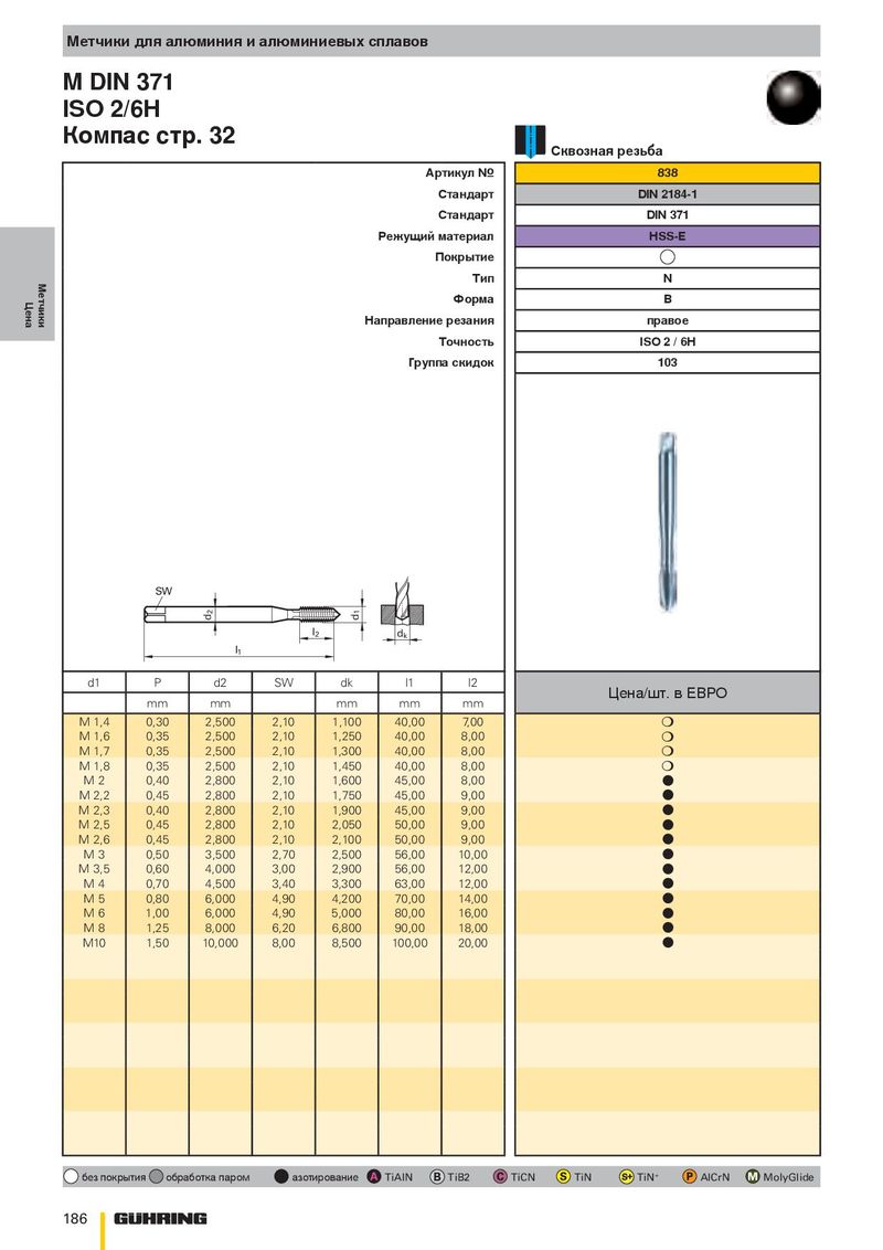 Метчики для алюминия и алюминиевых сплавов M DIN 371 ISO 2/6H Компас стр. 32 Сквозная резьба Артикул № 838 Стандарт DIN 2184-1 Стандарт DIN 371 Режущий материал HSS-E Покрытие Метчики Тип N Цена Форма B Направление резания правое Точность ISO 2 / 6H Группа скидок 103 SW 2 1 d d l 2 d k l 1 d1 P d2 SW dk l1 l2 Цена/шт. в ЕВРО mm mm mm mm mm M 1,4 0,30 2,500 2,10 1,100 40,00 7,00 ❍ M 1,6 0,35 2,500 2,10 1,250 40,00 8,00 ❍ M 1,7 0,35 2,500 2,10 1,300 40,00 8,00 ❍ M 1,8 0,35 2,500 2,10 1,450 40,00 8,00 ❍ M 2 0,40 2,800 2,10 1,600 45,00 8,00 ● M 2,2 0,45 2,800 2,10 1,750 45,00 9,00 ● M 2,3 0,40 2,800 2,10 1,900 45,00 9,00 ● M 2,5 0,45 2,800 2,10 2,050 50,00 9,00 ● M 2,6 0,45 2,800 2,10 2,100 50,00 9,00 ● M 3 0,50 3,500 2,70 2,500 56,00 10,00 ● M 3,5 0,60 4,000 3,00 2,900 56,00 12,00 ● M 4 0,70 4,500 3,40 3,300 63,00 12,00 ● M 5 0,80 6,000 4,90 4,200 70,00 14,00 ● M 6 1,00 6,000 4,90 5,000 80,00 16,00 ● M 8 1,25 8,000 6,20 6,800 90,00 18,00 ● M10 1,50 10,000 8,00 8,500 100,00 20,00 ● без покрытия обработка паром азотирование TiAlN TiB2 TiCN TiN TiN + AlCrN MolyGlide 186