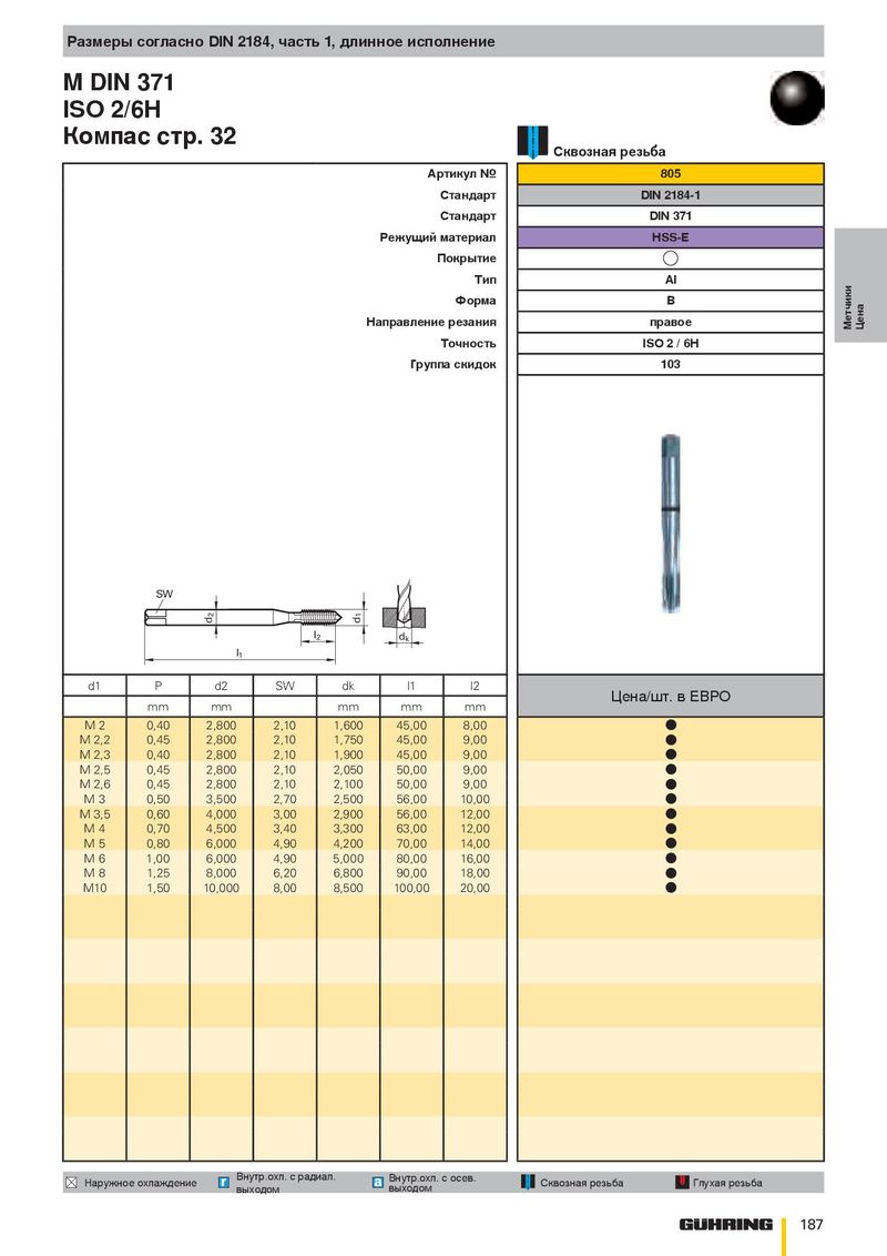 Размеры согласно DIN 2184, часть 1, длинное исполнение M DIN 371 ISO 2/6H Компас стр. 32 Сквозная резьба Артикул № 805 Стандарт DIN 2184-1 Стандарт DIN 371 Режущий материал HSS-E Покрытие Тип Al Форма B Направление резания правое Метчики Цена Точность ISO 2 / 6H Группа скидок 103 SW 2 1 d d l 2 d k l 1 d1 P d2 SW dk l1 l2 Цена/шт. в ЕВРО mm mm mm mm mm M 2 0,40 2,800 2,10 1,600 45,00 8,00 ● M 2,2 0,45 2,800 2,10 1,750 45,00 9,00 ● M 2,3 0,40 2,800 2,10 1,900 45,00 9,00 ● M 2,5 0,45 2,800 2,10 2,050 50,00 9,00 ● M 2,6 0,45 2,800 2,10 2,100 50,00 9,00 ● M 3 0,50 3,500 2,70 2,500 56,00 10,00 ● M 3,5 0,60 4,000 3,00 2,900 56,00 12,00 ● M 4 0,70 4,500 3,40 3,300 63,00 12,00 ● M 5 0,80 6,000 4,90 4,200 70,00 14,00 ● M 6 1,00 6,000 4,90 5,000 80,00 16,00 ● M 8 1,25 8,000 6,20 6,800 90,00 18,00 ● M10 1,50 10,000 8,00 8,500 100,00 20,00 ● Внутр.охл. с радиал. Внутр.охл. с осев. Наружное охлаждение Сквозная резьба Глухая резьба выходом выходом 187