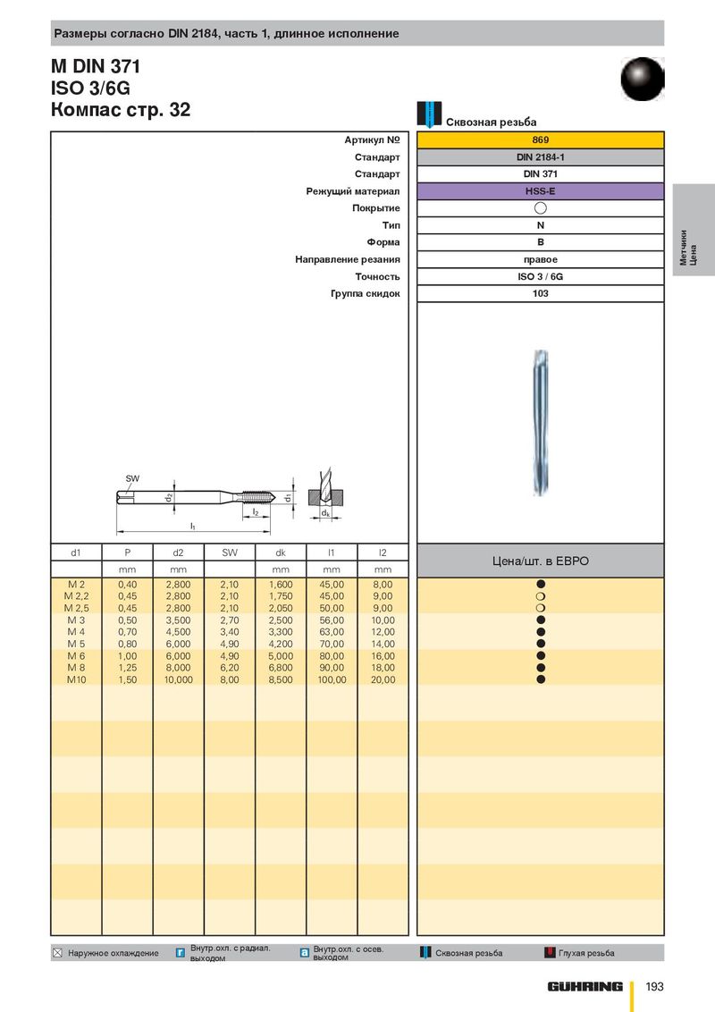 Размеры согласно DIN 2184, часть 1, длинное исполнение M DIN 371 ISO 3/6G Компас стр. 32 Сквозная резьба Артикул № 869 Стандарт DIN 2184-1 Стандарт DIN 371 Режущий материал HSS-E Покрытие Тип N Форма B Направление резания правое Метчики Цена Точность ISO 3 / 6G Группа скидок 103 SW 2 1 d d l 2 d k l 1 d1 P d2 SW dk l1 l2 Цена/шт. в ЕВРО mm mm mm mm mm M 2 0,40 2,800 2,10 1,600 45,00 8,00 ● M 2,2 0,45 2,800 2,10 1,750 45,00 9,00 ❍ M 2,5 0,45 2,800 2,10 2,050 50,00 9,00 ❍ M 3 0,50 3,500 2,70 2,500 56,00 10,00 ● M 4 0,70 4,500 3,40 3,300 63,00 12,00 ● M 5 0,80 6,000 4,90 4,200 70,00 14,00 ● M 6 1,00 6,000 4,90 5,000 80,00 16,00 ● M 8 1,25 8,000 6,20 6,800 90,00 18,00 ● M10 1,50 10,000 8,00 8,500 100,00 20,00 ● Внутр.охл. с радиал. Внутр.охл. с осев. Наружное охлаждение Сквозная резьба Глухая резьба выходом выходом 193