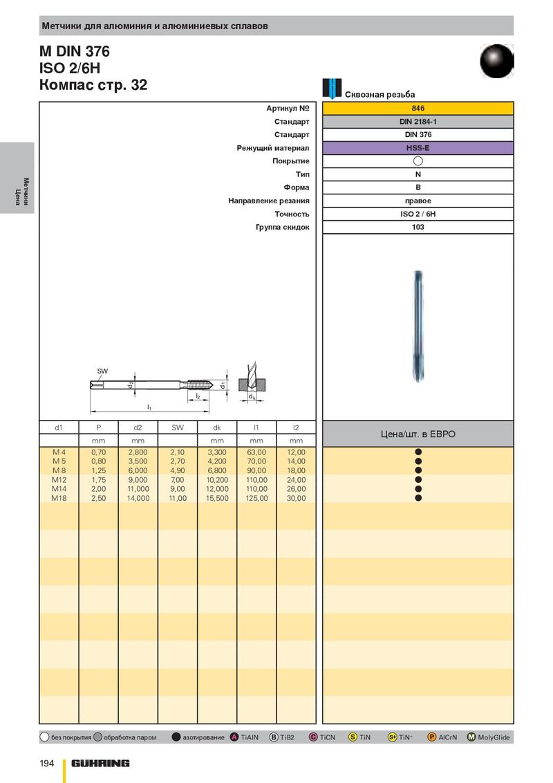 Метчики для алюминия и алюминиевых сплавов M DIN 376 ISO 2/6H Компас стр. 32 Сквозная резьба Артикул № 846 Стандарт DIN 2184-1 Стандарт DIN 376 Режущий материал HSS-E Покрытие Метчики Тип N Цена Форма B Направление резания правое Точность ISO 2 / 6H Группа скидок 103 SW 2 1 d d l 2 d k l 1 d1 P d2 SW dk l1 l2 Цена/шт. в ЕВРО mm mm mm mm mm M 4 0,70 2,800 2,10 3,300 63,00 12,00 ● M 5 0,80 3,500 2,70 4,200 70,00 14,00 ● M 8 1,25 6,000 4,90 6,800 90,00 18,00 ● M12 1,75 9,000 7,00 10,200 110,00 24,00 ● M14 2,00 11,000 9,00 12,000 110,00 26,00 ● M18 2,50 14,000 11,00 15,500 125,00 30,00 ● без покрытия обработка паром азотирование TiAlN TiB2 TiCN TiN TiN + AlCrN MolyGlide 194