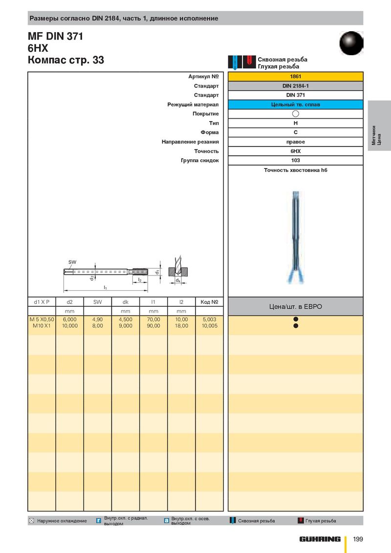 Размеры согласно DIN 2184, часть 1, длинное исполнение MF DIN 371 6HX Сквозная резьба Компас стр. 33 Глухая резьба Артикул № 1861 Стандарт DIN 2184-1 Стандарт DIN 371 Режущий материал Цельный тв. сплав Покрытие Тип H Форма C Направление резания правое Метчики Цена Точность 6HX Группа скидок 103 Точность хвостовика h6 SW 1 d 2 d l 2 d k l 1 d1 X P d2 SW dk l1 l2 Код № Цена/шт. в ЕВРО mm mm mm mm M 5 X0,50 6,000 4,90 4,500 70,00 10,00 5,003 ● M10 X1 10,000 8,00 9,000 90,00 18,00 10,005 ● Внутр.охл. с радиал. Внутр.охл. с осев. Наружное охлаждение Сквозная резьба Глухая резьба выходом выходом 199