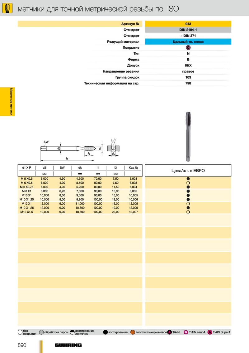 Р метчики для точной метрической резьбы по ISO Артикул Ns 943 Стандарт DIN 2184-1 Стандарт ~ DIN 371 Режущий материал Цельный тв. сплав Покрытие • Тип N Форма В Допуск 6НХ Направление резания правое Группа скидок 103 Техническая информация на стр. 798 Машинные метчики I d1 ХР d2 SW dk I2 '1 Код № М М М М М М М М М 5 Х0,5 6,000 4,90 4,500 70,00 7,50 5,003 М 6 Х0,5 6,000 4,90 5,500 80,00 7,50 6,003 М 6 Х0,75 6,000 4,90 5,200 80,00 11,50 6,004 М8Х1 8,000 6,20 7,000 90,00 15,00 8,005 М10Х1 10,000 8,00 9,000 90,00 15,00 10,005 М10Х1.25 10,000 8,00 8,800 100,00 19,00 10,006 М12Х1 12,000 9,00 11,000 100,00 15,00 12,005 М12Х1.25 12,000 9,00 10,800 100,00 19,00 12,006 М12Х1.5 12,000 9,00 10,500 100,00 22,00 12,007 С) покрытия О обработка паром © НИе ^^азотирование золотисто-коричневое 1^1 TiAIN Q TiAIN nanoA (A) TiAIN SuperA 890 E U H B IN E