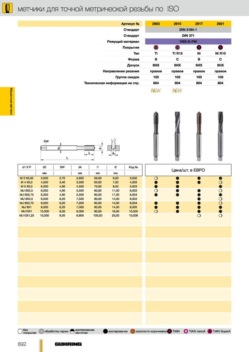 Р метчики для точной метрической резьбы по ISO Артикул Ns 2903 2910 2917 2921 Стандарт DIN 2184-1 Стандарт DIN 371 Режущий материал HSS-E-PM Покрытие • • О О Тип Ti Ti R15 Ni Ni R10 Форма В С В С Допуск 6НХ 6HX 6НХ 6НХ Направление резания правое правое правое правое Группа скидок 103 103 103 103 Техническая информация на стр. 804 804 804 804 Машинные метчики N E W N E W SW / ННШ ШШ' 4 щ а т - шг* Л 2 ~ к). "7 3 ii d1 ХР d2 SW dk I2 И Код № Ц е н а/ш т . в Е В Р О М М М М М М М М М 3 Х0,35 3,500 2,70 2,650 56,00 6,00 3,002 О • • • М 4 Х0,5 4,500 3,40 3,500 63,00 7,50 4,003 • • • о М 5 Х0,5 6,000 4,90 4,500 70,00 8,50 5,003 • • • MJ 6X0,5 6,000 4,90 5,500 80,00 11,00 6,003 О • • о MJ 6X0,75 6,000 4,90 5,200 80,00 11,00 6,004 • • • • MJ 8X0,5 8,000 6,20 7,500 80,00 14,00 8,003 • о MJ 8X0,75 8,000 6,20 7,200 80,00 14,00 8,004 • • • о MJ8X1 8,000 6,20 7,000 90,00 14,00 8,005 • • • • М Л 0X1 10,000 8,00 9,000 90,00 16,00 10,005 о • • • М Л 0X1,25 10,000 8,00 8,800 100,00 20,00 10,006 о о С) покрытия О обработка паром © НИе ^^азотирование золотисто-коричневое 1^1 TiAIN Q TiAIN nanoA (A) TiAIN SuperA 892 E U H B IN E
