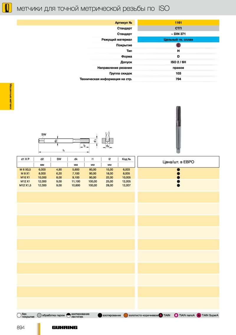 Р метчики для точной метрической резьбы по ISO Артикул Ns 1161 Стандарт СТП Стандарт ~ DIN 371 Режущий материал Цельный тв. сплав Покрытие • Тип Н Форма D Допуск ISO 2 / 6Н Направление резания правое Группа скидок 103 Техническая информация на стр. 794 Машинные метчики SW е й d1 ХР d2 SW dk I2 '1 Код № Ц е н а/ш т . в Е В Р О М М М М М М М М М 6 Х0,5 6,000 4,90 5,600 80,00 15,00 6,003 М8Х1 8,000 6,20 7,100 90,00 18,00 8,005 М10Х1 10,000 8,00 9,100 90,00 22,00 10,005 М12Х1 12,000 9,00 11,100 100,00 25,00 12,005 М12Х1.5 12,000 9,00 10,600 100,00 28,00 12,007 С) покрытия О обработка паром © НИе ^^азотирование (^) золотисто-коричневое^^ TiAIN Q TiAIN nanoA (A) TiAIN SuperA 894 E U H B IN E